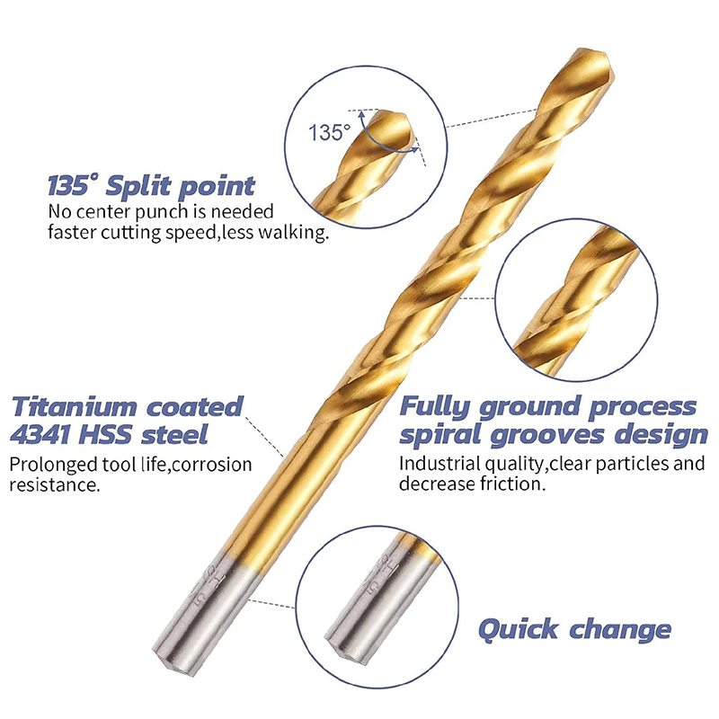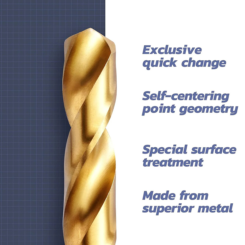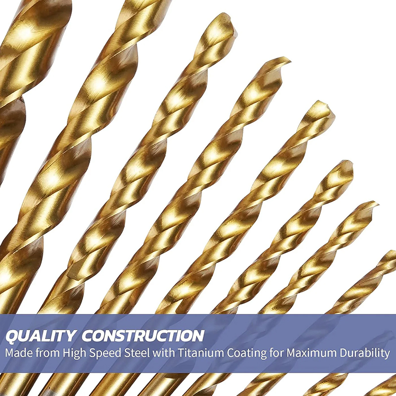 High-Quality: Durable Material Made of premium steel with a corrosion-resistant gold TiN coating, this set ensures superior toughness and a long service life. The smooth surface reduces friction during drilling, keeping bits cool and preventing breakage even under heavy use.