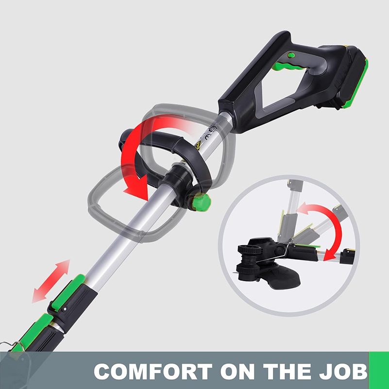 Multiple Safety Controls: Electric cordless weed whacker battery powered features dual switches that are held down simultaneously for dual safety control to prevent accidental activation of furniture and a splash proof grass cover to prevent debris from flying and soiling clothes.