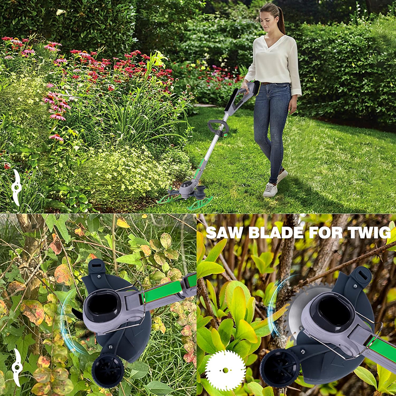 Equipped with 1PC 40T TCT blade, 2PC 2T metal blades, and 8PCS plastic blades, it can handle various grass and light vegetation cutting tasks, making it ideal for maintaining lawn edges, flower beds, and garden paths.