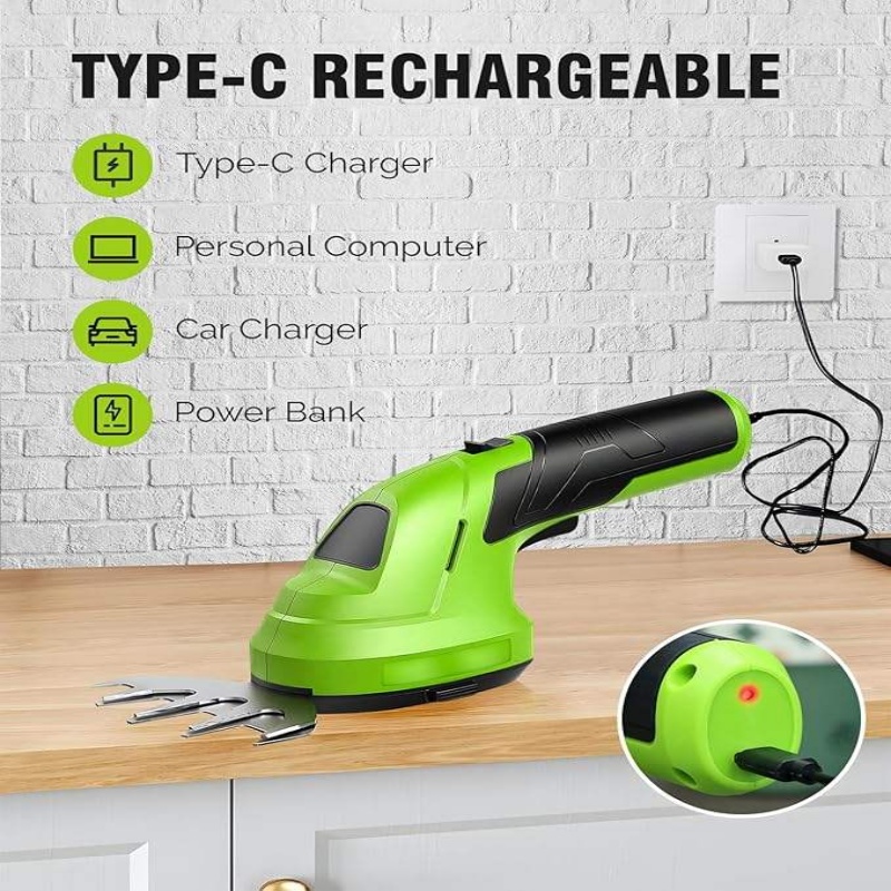 USB-C CHARGING: The shrub trimmer can be charged using the included Type-C cable by connecting it to a phone charger (5V/2A), laptop/PC, car, or power bank, offering ultimate flexibility. Equipped with a high-capacity 2000mAh battery that provides extended runtime, without worrying about battery life