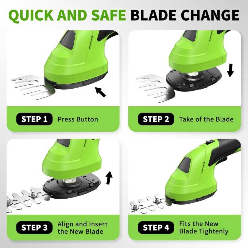 LIGHTWEIGHT & ERGONOMIC: Weighing only 1.07 pounds, this bush trimmer is exceptionally lightweight and easy to handle. Its ergonomic handle offers a comfortable, secure grip, making it ideal for extended use. Moreover, no tools required-simply press the buttons on both sides to switch the hedge trimmer blades
