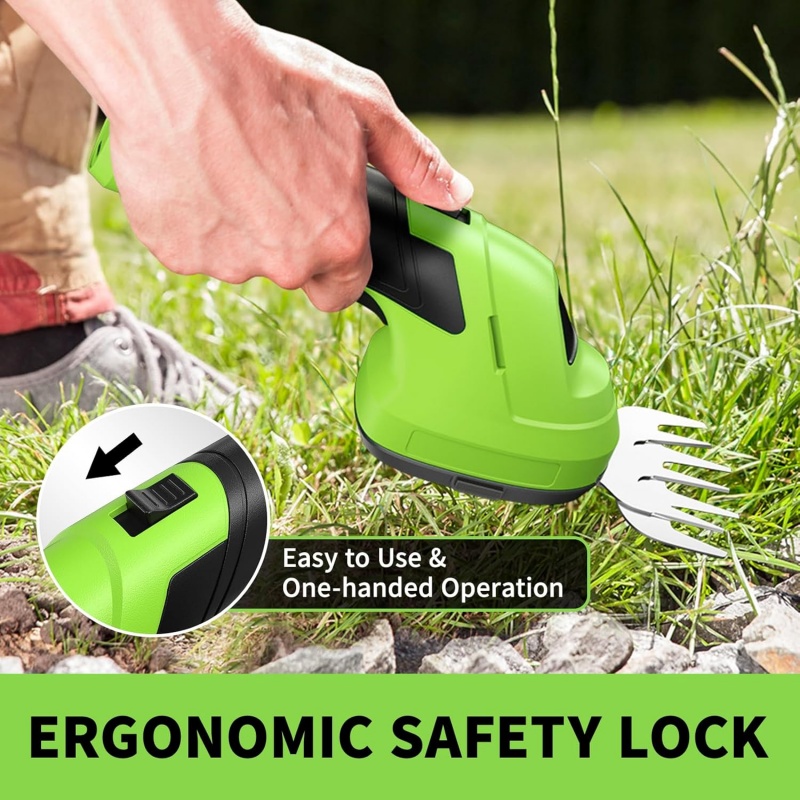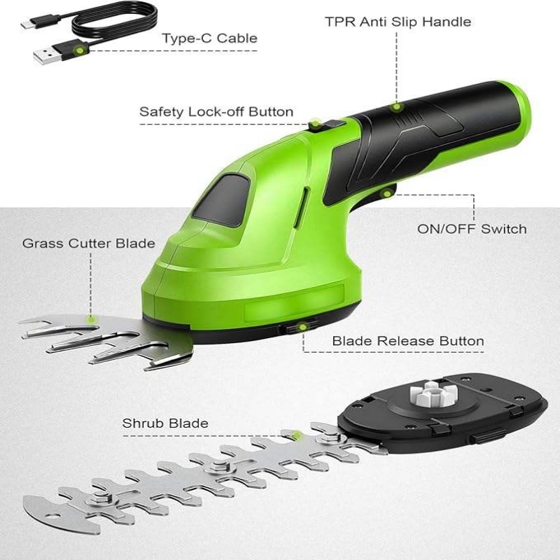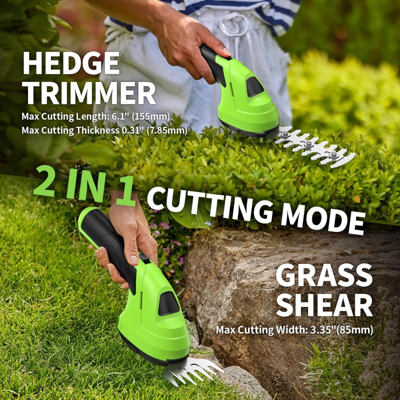 This 2-in-1 grass shears & bush trimmer features a 4.65" shrub blade and 2.95" grass blade, ideal for lawn edges, potted plants, hedges and small trees. USB-C rechargeable with a 2000mAh battery for long runtime. Two-step safety start prevents accidental activation. At only 1.07 pounds, it's lightweight and ergonomic with easy blade switching, delivering clean, tidy trimming effortlessly.