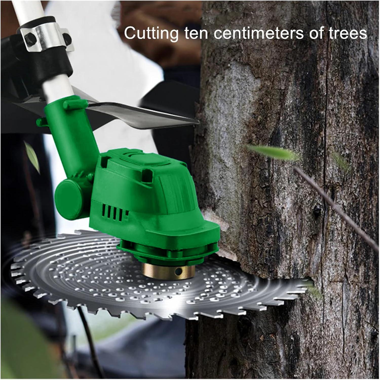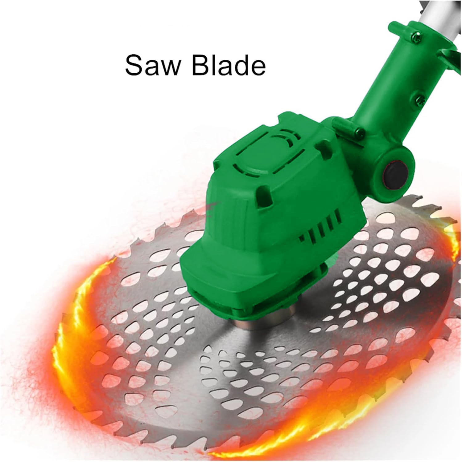 The Cordless Grass Trimmer comes with 1pc tct blade and 2pcs 2t blades, including a grass trimmer head for mowing lawns, weeds, and small shrubs, and the circular saw blade is designed specifically for tackling thicker shrubs.