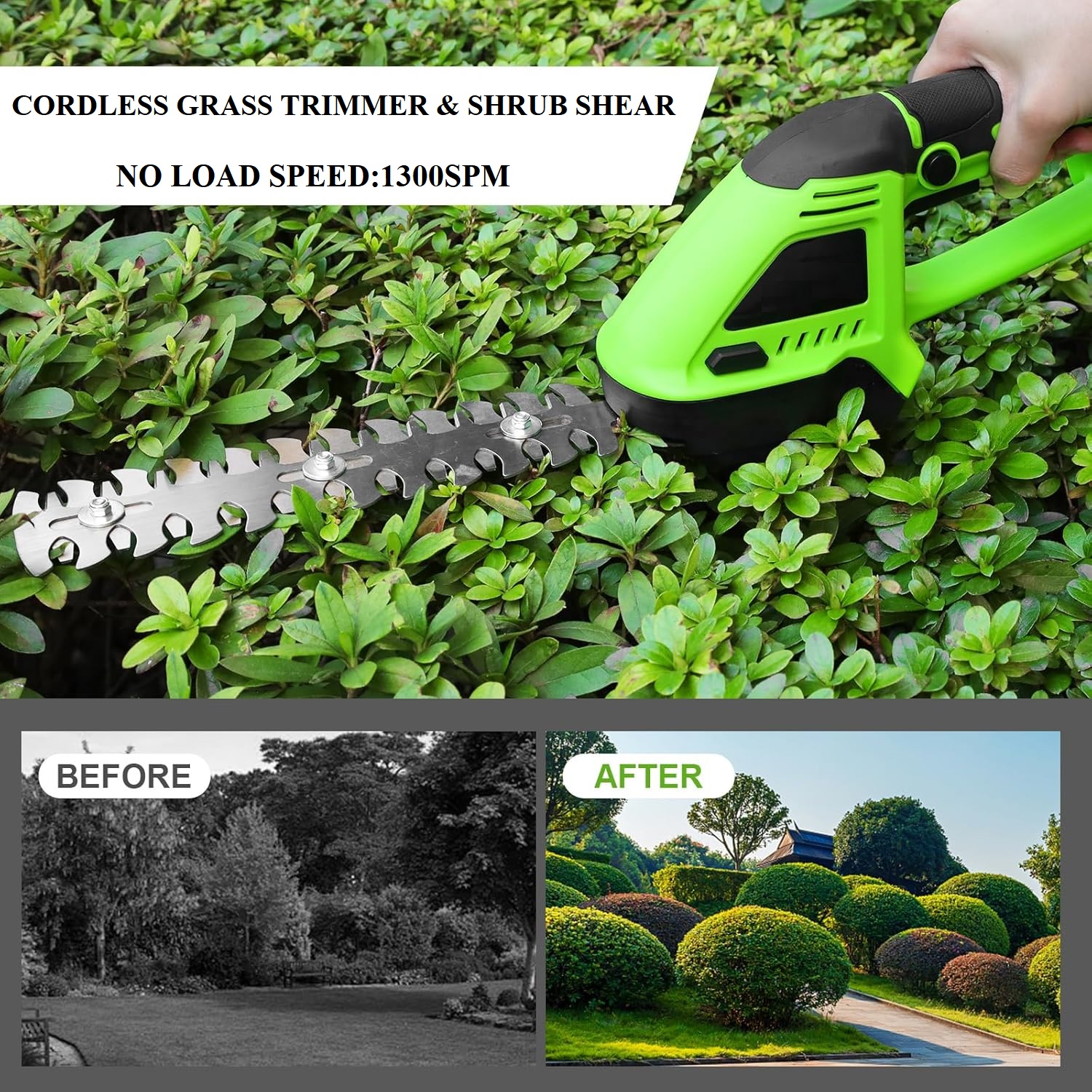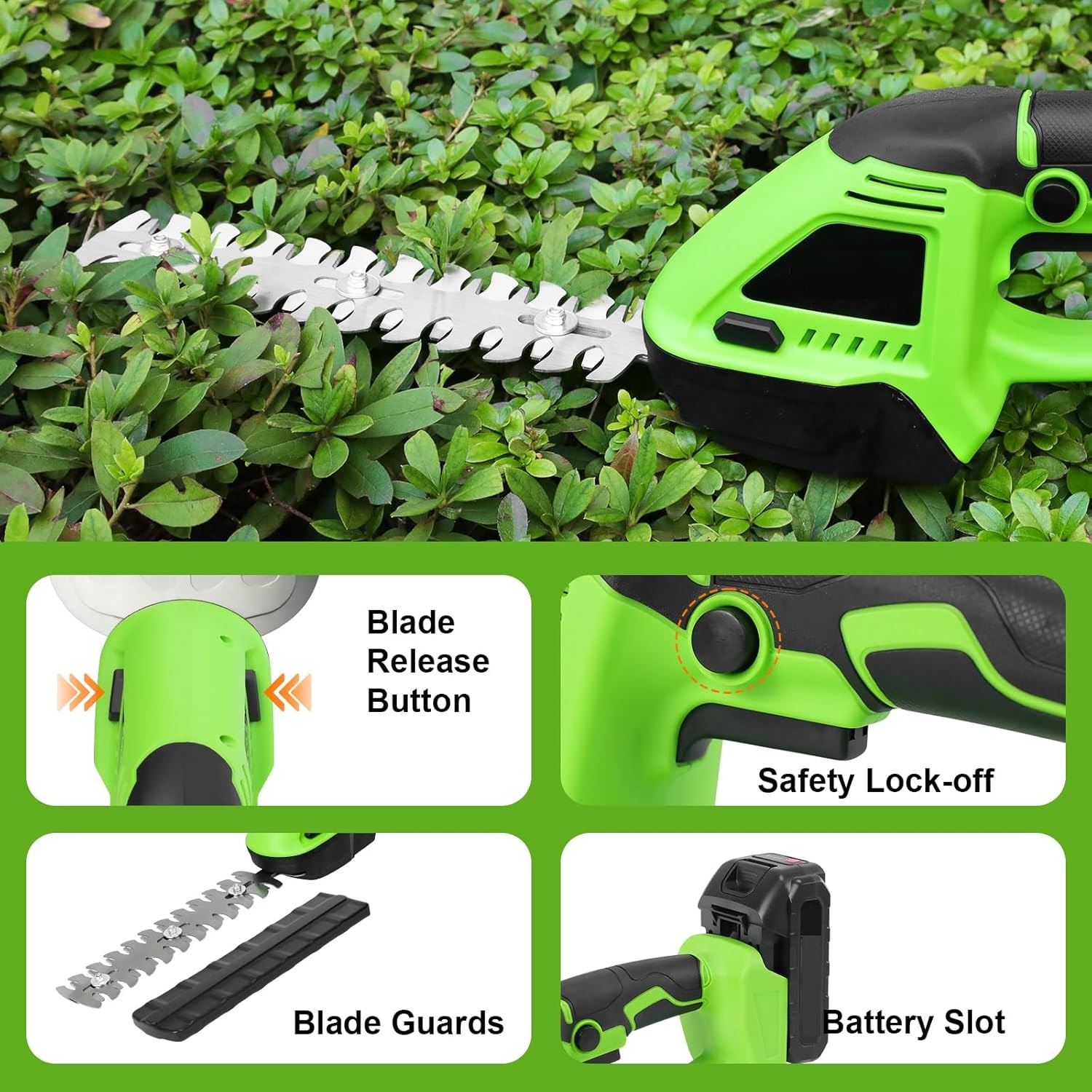 Cordless Hedge Trimmer & Shrub Shear: This 2-in-1 electric garden tool comes with garden shears grass blade; The hand held hedge trimmers cordless allows for quick blade changes with the blade release button; The short blade is used for cutting grass and the long blade is used for cutting fine branches on hedges, bushes and ornamental shrubs