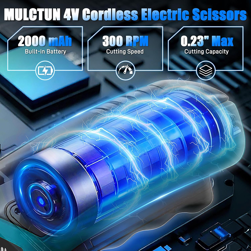 Stable Power & Long Endurance: Equipped with premium 4V 2000mAh large capacity battery, this cordless scissor provides consistent no-load speed at 300/min. It supports long lasting runtime for continuous cutting work.