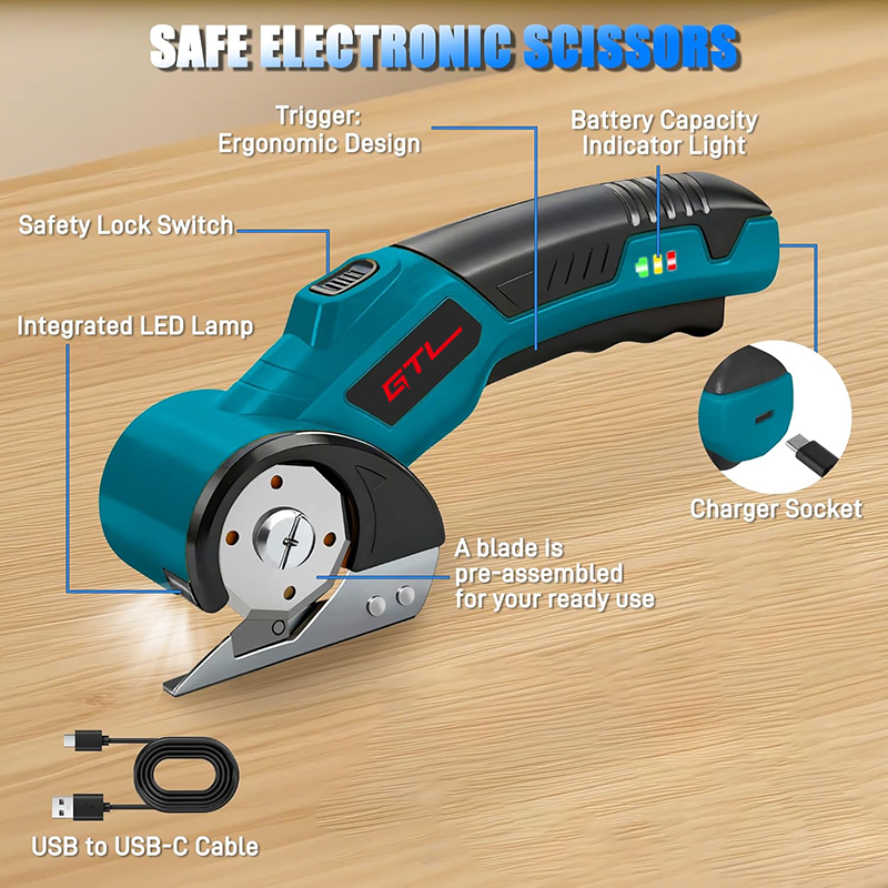 This lightweight cordless electric scissor features a 4V 2000mAh built-in rechargeable battery, delivering stable constant speed up to 300 cuts per minute. It comes with an LED power indicator and Type-C fast charging design for easy daily use and long working time.