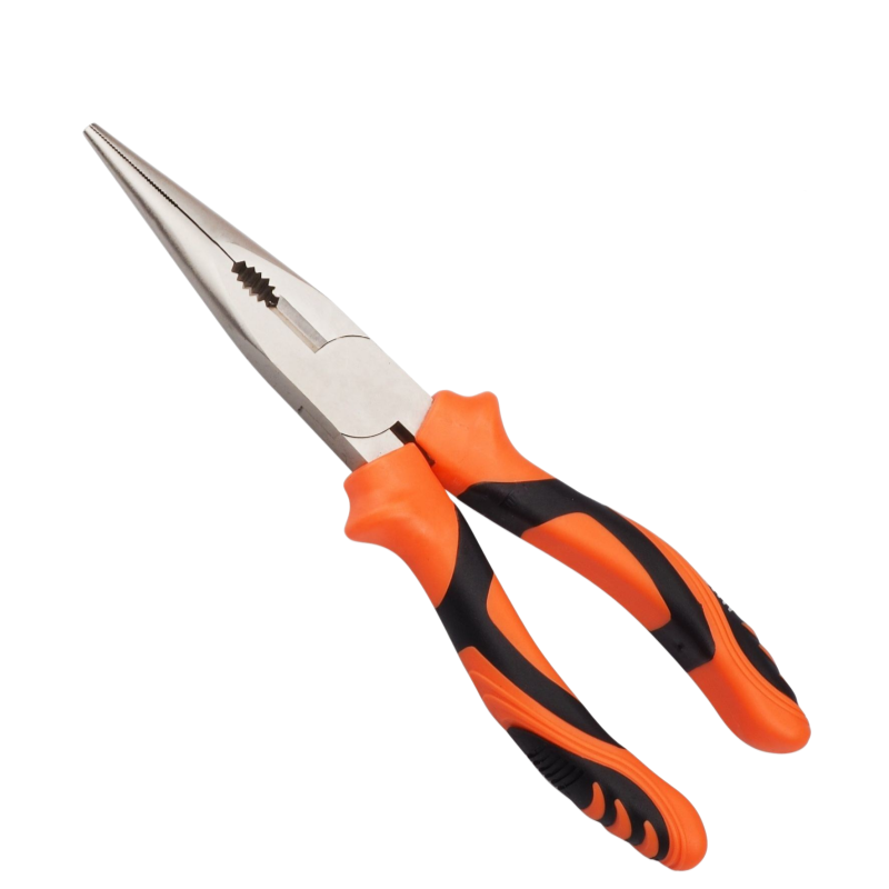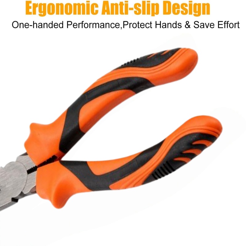 These 6-inch needle-nose pliers are forged from premium chrome-vanadium steel with eco-friendly TPR handles. Built with HRC6062 hardened cutting edges and a labor-saving spring, they deliver strong cutting force and stable performance. The ergonomic non-slip, oil-resistant grip reduces fatigue. Featuring a long, precise head for confined spaces, they perform gripping, cutting, winding, and stripping. Ideal for electronics repair, DIY, and daily metal wire work.
