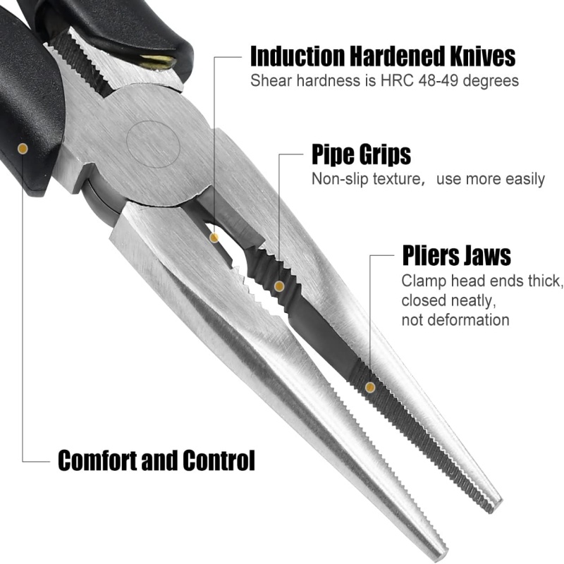 Labor-saving Design:The needle-nose pliers are designed on the principle of lever. The length of the pliers wall is larger than the pliers head, so it saves more energy when using. Lengthen clamp head design, easy to use in narrow space; It has the functions of fastening, clamping, winding, cutting and stripping