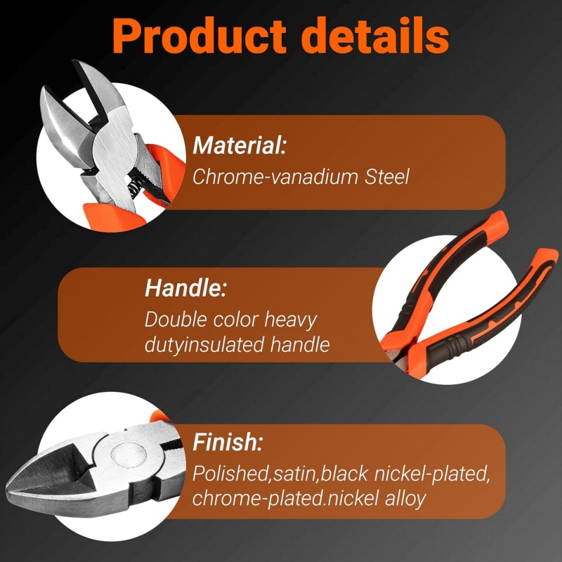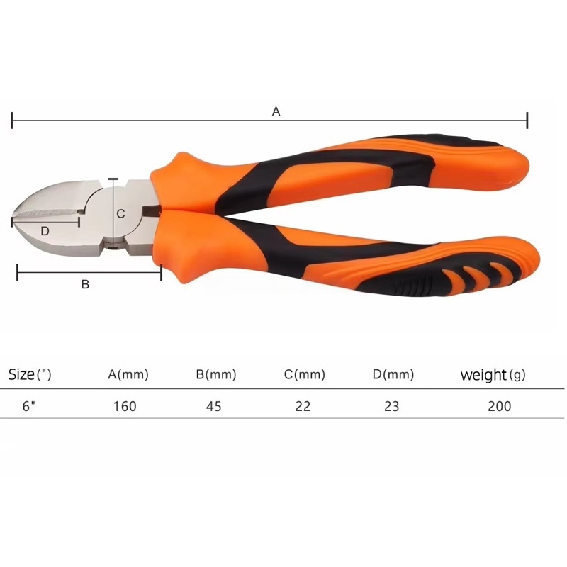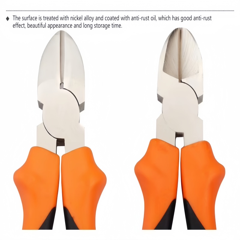These diagonal cutting pliers are forged from highquality steel for superior hardness and strength, stable and durable under heavy use. Hightemperature quenching enhances sharpness and rust resistance, easily cutting cables, steel, and copper wires. The wideopening design ensures smooth cutting. Ergonomic nonslip handles reduce fatigue for secure grip. Ideal for industrial, electrical, and daily cutting tasks.