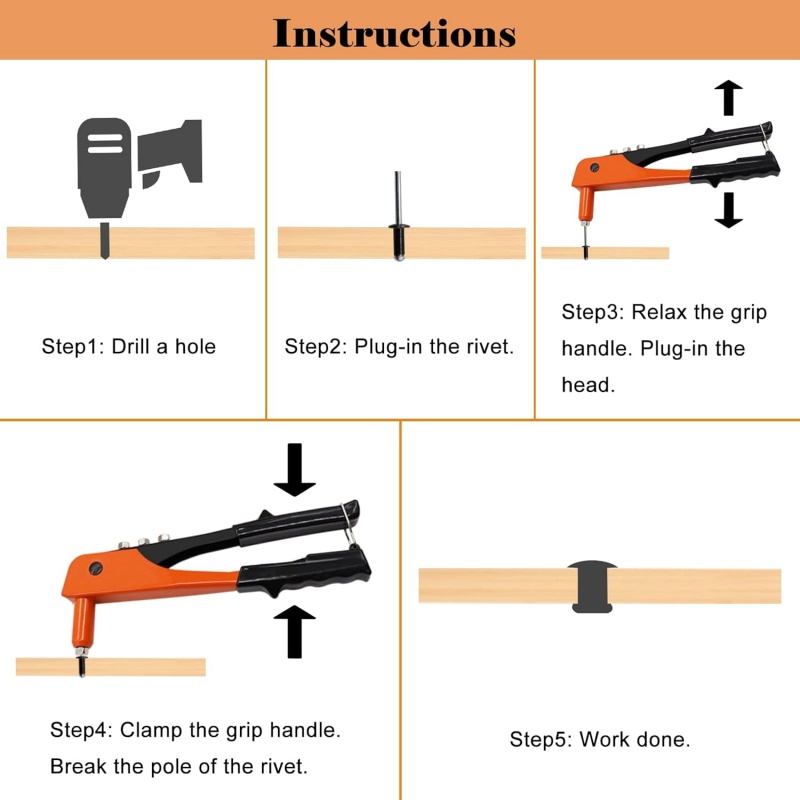 Easy to Operate: The manual rivet gun allows for quick single handed use, simply adjust the length, insert the rivet, and squeeze the handle without needing additional tools.
