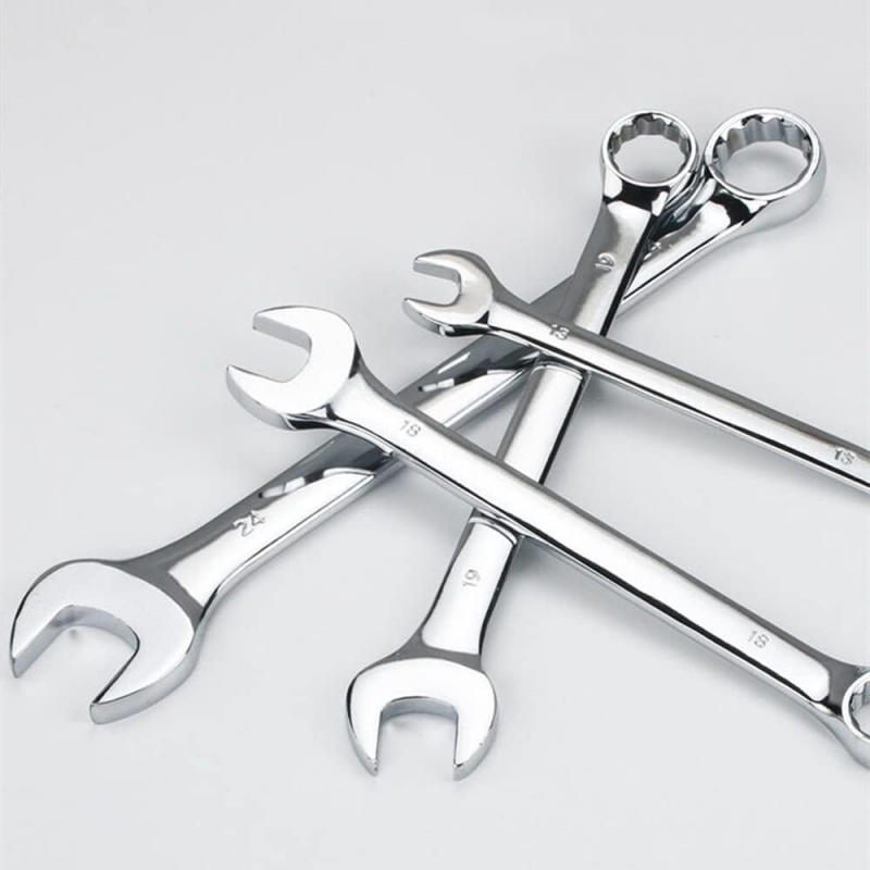 This wrench set features a complete size range from 6mm to 38mm with no skipped sizes, offering flexible selection for various needs. Constructed from high-quality steel with a polished chrome finish, it delivers exceptional strength, durability, and corrosion resistance. The 15-degree offset box end enables easy operation in tight spaces, while the 12-point design ensures fast fastener engagement. Ideal for auto, bicycle, mechanical, pipeline, and household maintenance tasks.