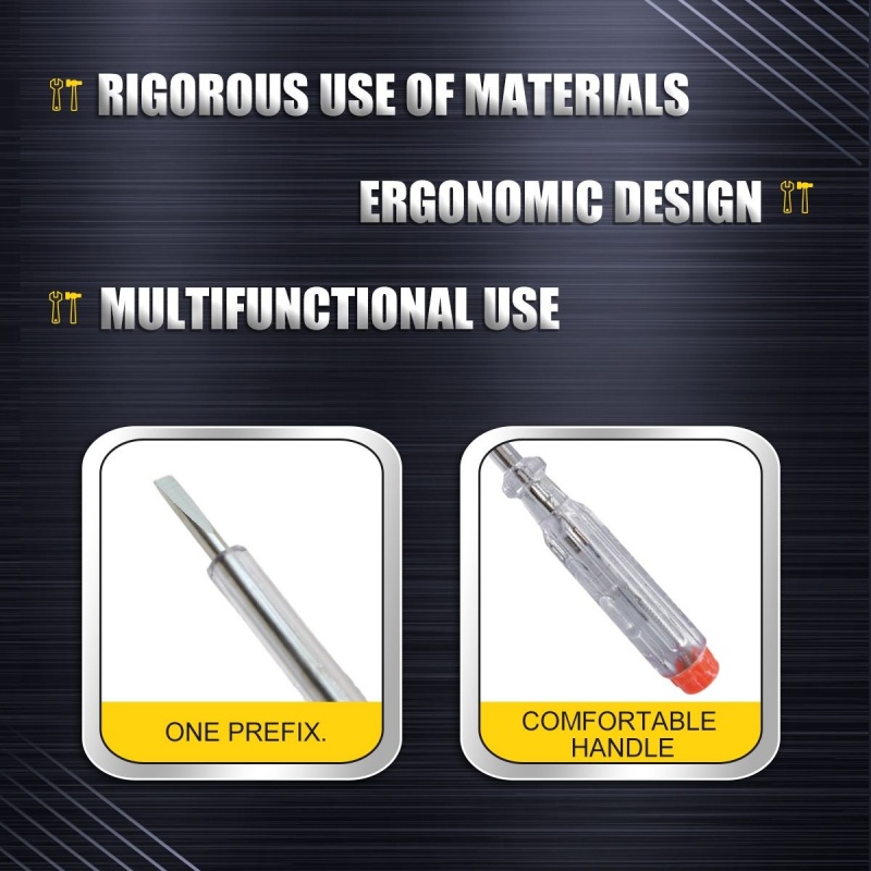 Two Usage:Two kinds of applications,one for measuring circuit electrical penand the other for screwdriver.Two types of screwdriver tips on the both end of metal rod-slotted and cross-recess.When you pull out the metal rod,please insert the rod to the deepest position to make full contact.