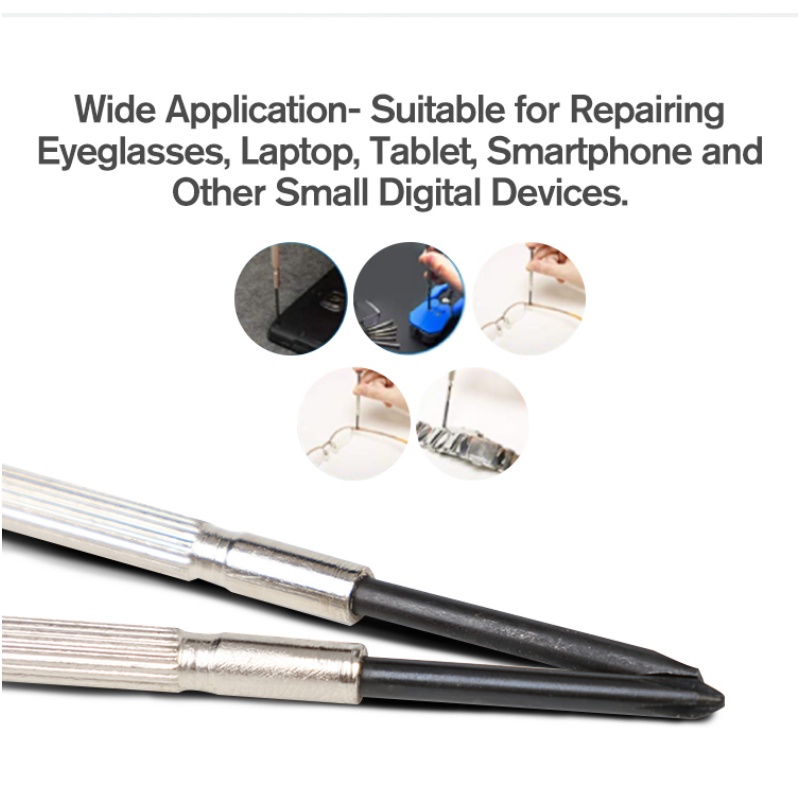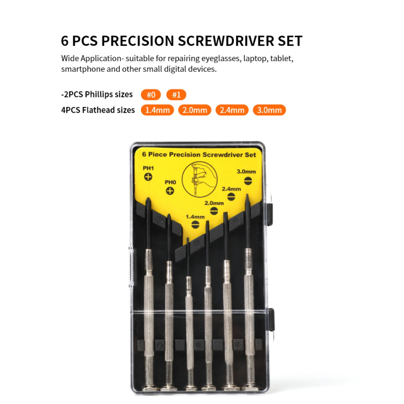 This 6-in-1 precision screwdriver set includes 2 Phillips (#0, #1) and 4 flathead (1.4mm, 2.0mm, 2.4mm, 3.0mm) drivers. Built with rust-proof, hardened black oxide shafts and a comfortable rotating grip, it comes in a compact plastic case for easy carrying. Ideal for repairing eyeglasses, watches, jewelry, phones, laptops, game consoles and other small electronics, it's a must-have for both pros and home DIY users.
