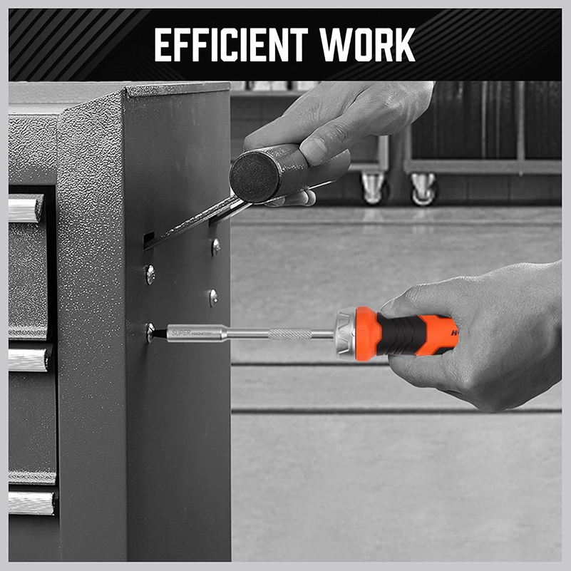 Ergonomic & Efficient Operation: Features a comfortable, non-slip screwdriver handle that reduces hand fatigue during extended use. The 1/4" drive design allows quick bit/socket changes, making it easy to switch between different screw types and sizes in seconds.