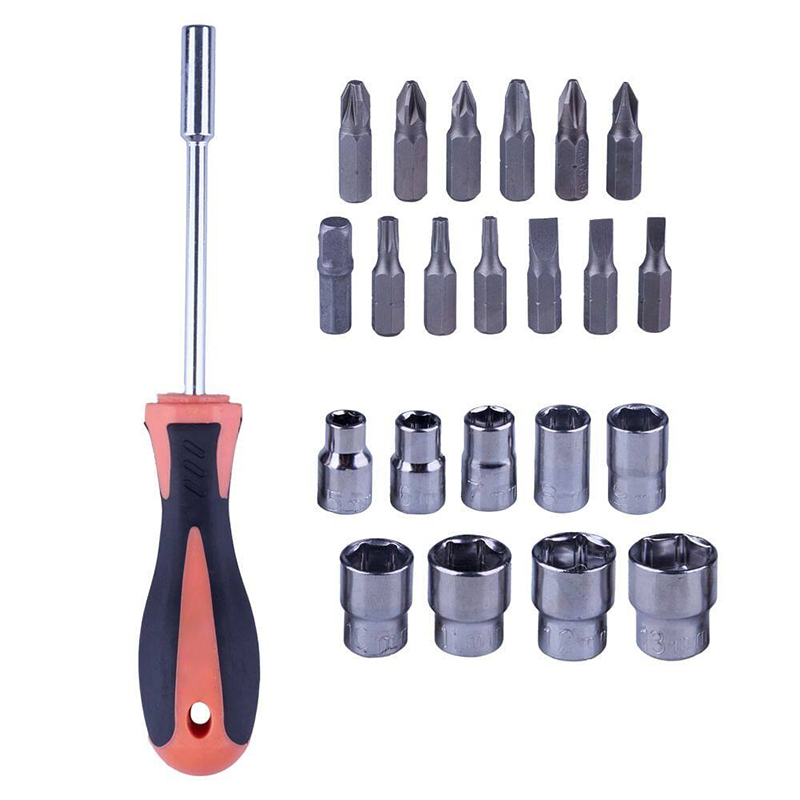 This comprehensive tool set includes 1 screwdriver handle, 12 precision screwdriver bits, and 10 metric sockets, covering all common screw and fastener types for daily repair tasks.