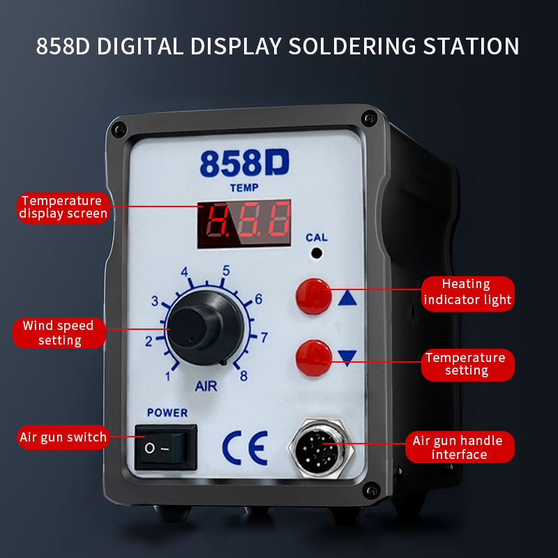 This digital soldering station features precise temperature control from 100°C to 480°C (ºC/ºF switchable) with a clear LED display. It uses an 800W brushless blower for adjustable airflow, a large copper-coil transformer for stable performance, and an ergonomic, lightweight handle. Ideal for electronics repair, PCB work, and various heating applications.