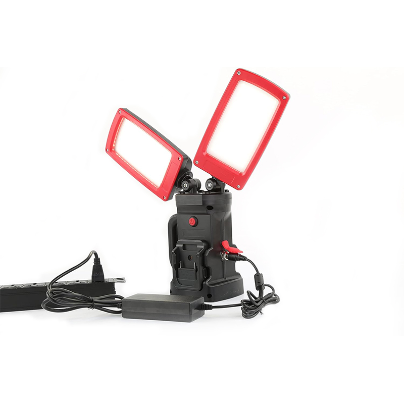 This AC/DC 20V LED work light features dual independently controlled lamp heads, 7 brightness levels (up to 12000LM), and 5000K daylight white light with CRI>80, ideal for clear, flicker-free lighting in video/photography and work scenarios.