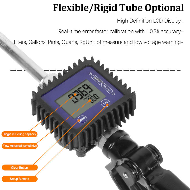 This digital oil control valve features flexible configurations (rigid tube/manual tip or flexible hose/semi-auto tip) for controlled fluid flow. Equipped with a 5-digit LCD (4 units: L/GAL/PT/QT) and intuitive buttons, it tracks single/total dispense volumes accurately. Boasting an ergonomic handle, durable aviation aluminum nozzle (anti-drip/leak), and low battery indicator, it's ideal for factories, gas stations-efficiently filling gear oil, engine oil, antifreeze, etc.