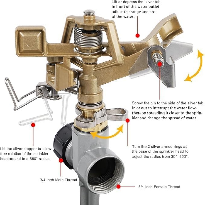 Impact Sprinkler With Spike: Heavy duty zinc alloy lawn impact sprinkler head with stand for yard, lawn and grass Irrigation. The lawn sprinkler can be adjusted from full circles of 360 degrees to partial circle patterns that turn 20 degrees to 340 degrees. Adjust the spray range and radian of water to make the irrigation in the garden fun