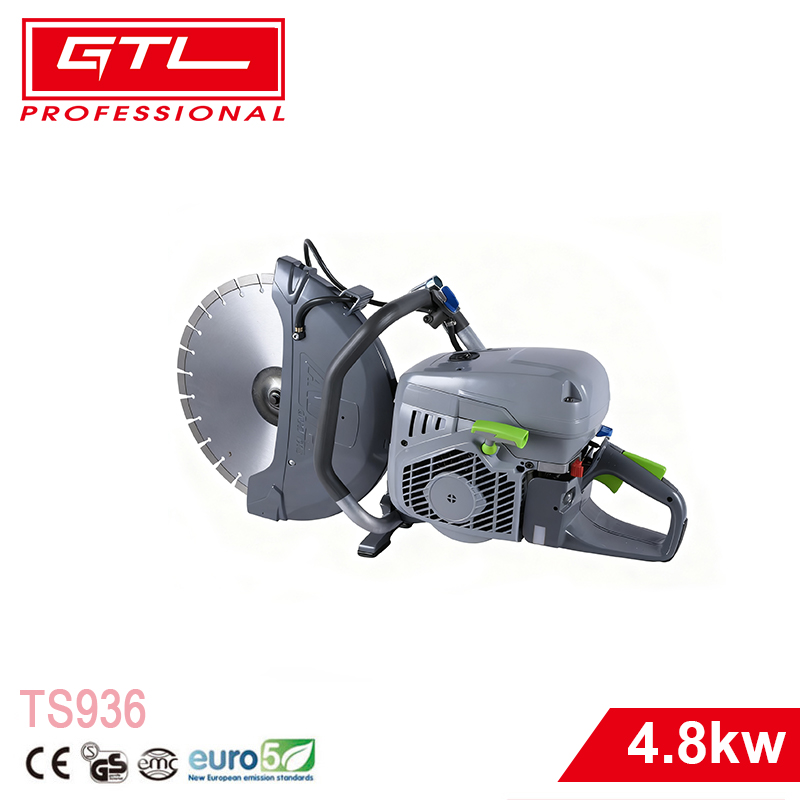 A high-performance gas-powered cut-off saw with a 93.6cc two-stroke single-cylinder air-cooled engine, delivering 4.8KW rated power, ideal for heavy-duty cutting tasks with a 350mm blade and max cutting depth of 125mm.