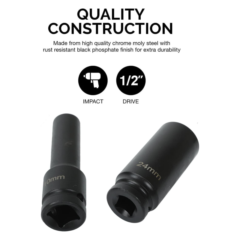 High-Quality Material: Sockets undergo utilizing drop forging and heat treatment on chromium molybdenum steel; black phosphorescent finish, that deeply hardens the rust-proof socket; enhances its impact resistance while improving toughness and durability