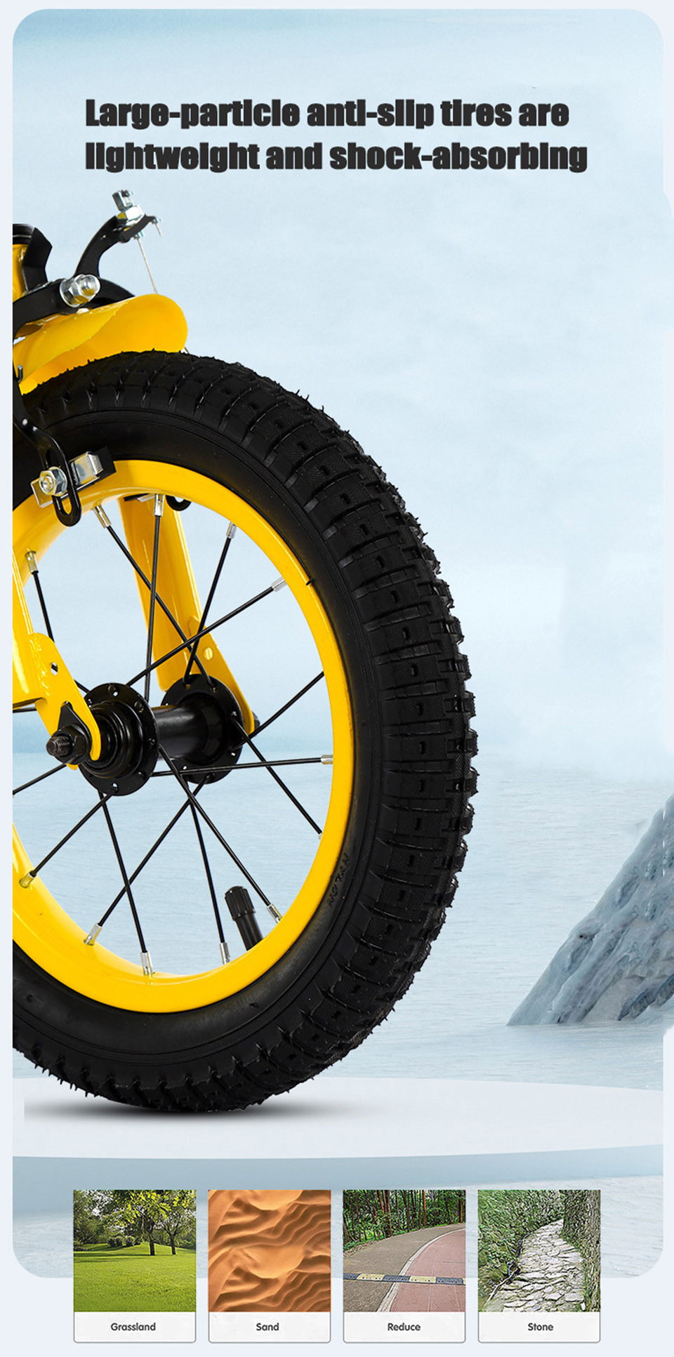 All-Terrain Anti-Slip Shock-Absorbing Tires: Large-particle anti-slip tire treads deliver unshakable grip on every surface, including pavement, grass, sand and stone paths. Thickened sidewalls not only prevent punctures and wear, but also absorb shocks effectively to avoid jolts that could cause kids to lose balance.