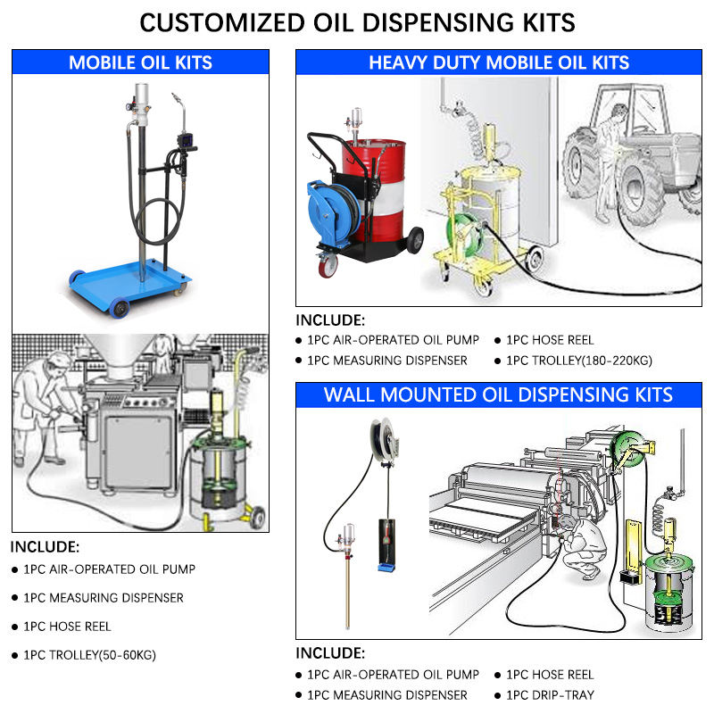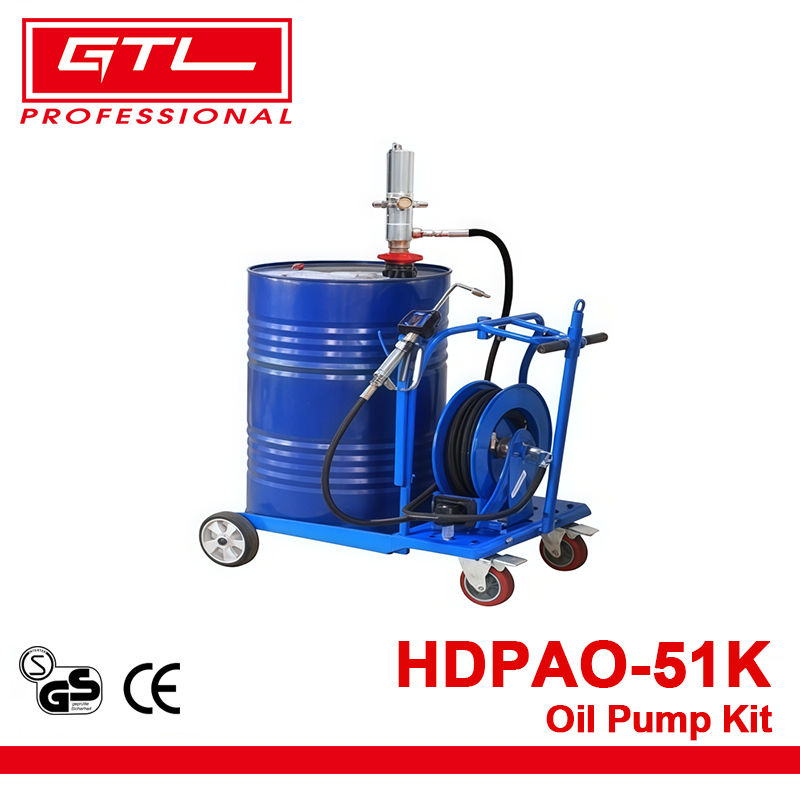 The HDPAO-51K is a pneumatic Oil Pump Kit designed for efficient oil transfer. Its core component is a 940mm-long pneumatic pump (available in 3:1/5:1 specs), paired with a 15m hose, hose reel, nozzle, and air filter for convenient operation. The kit comes mounted on a mobile frame (with wheels) for easy maneuverability, but note that the oil barrel is not included. Ideal for scenarios requiring reliable, mobile oil dispensing.