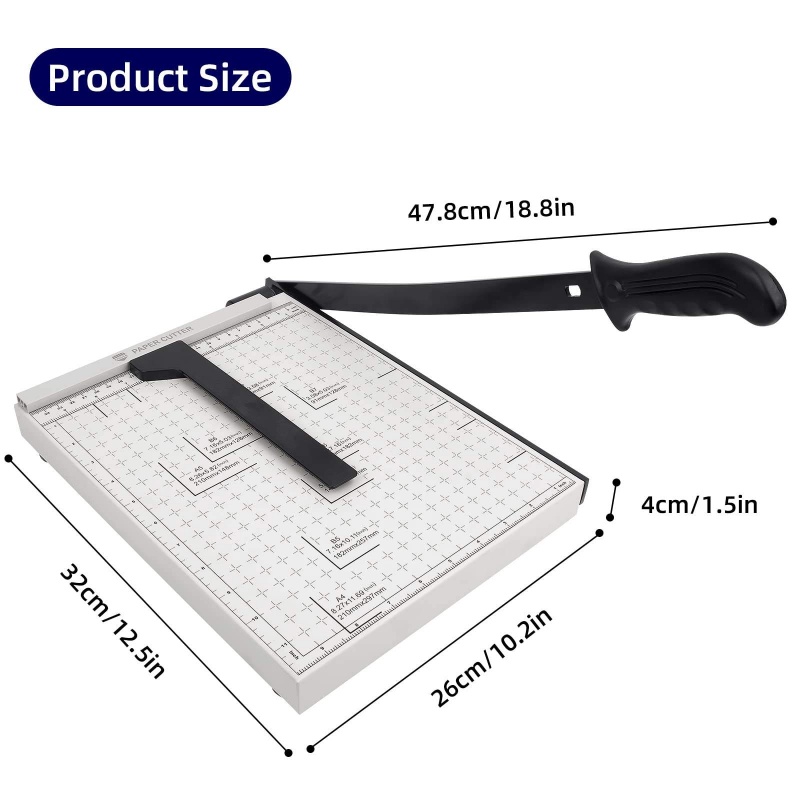 This 30cm steel base guillotine cutter is a reliable tool for A4 paper and beyond-compatible with cardstock, laminated sheets, vinyl, and photo paper. It cuts up to 10 sheets per pass with a sharp guillotine blade, paired with a cutting guide for precision. The 1.6kg compact design (30cm×25cm) saves space, while the non-slip base and safety lock ensure safe use. Ideal for offices, craft rooms, or home projects, it combines versatility, convenience, and safety for seamless paper-cutting tasks.