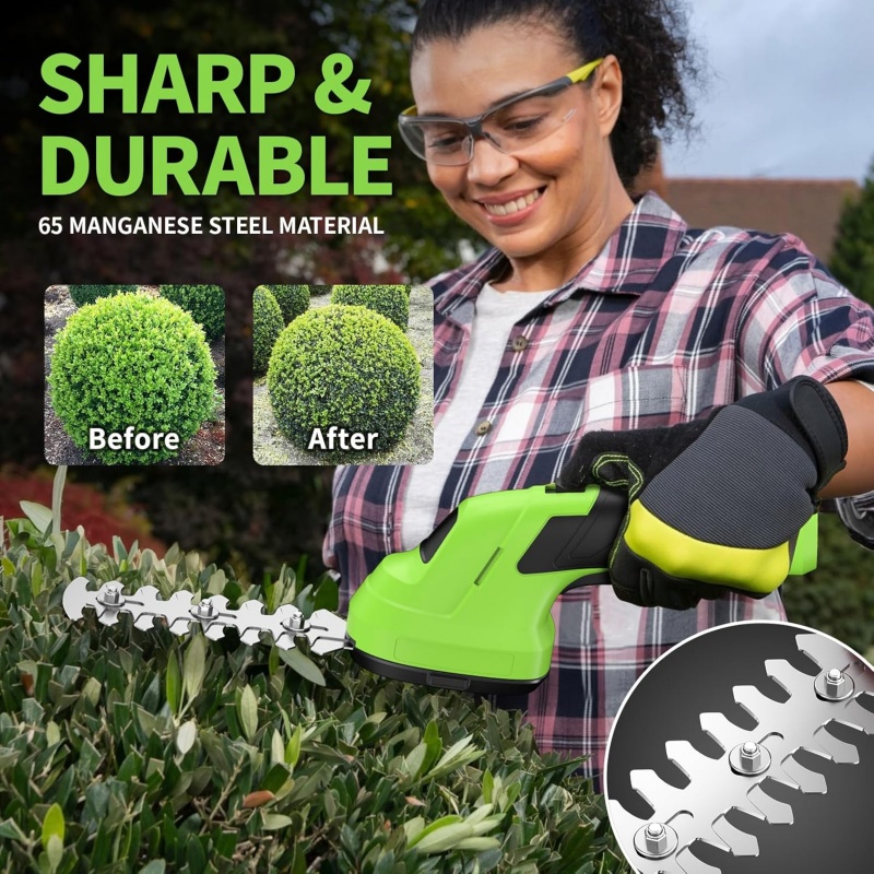 This 2-in-1 grass shears & bush trimmer features a 4.65" shrub blade and 2.95" grass blade, ideal for lawn edges, potted plants, hedges and small trees. USB-C rechargeable with a 2000mAh battery for long runtime. Two-step safety start prevents accidental activation. At only 1.07 pounds, it's lightweight and ergonomic with easy blade switching, delivering clean, tidy trimming effortlessly.