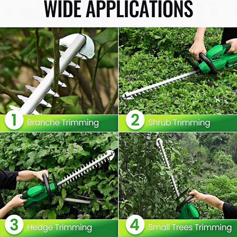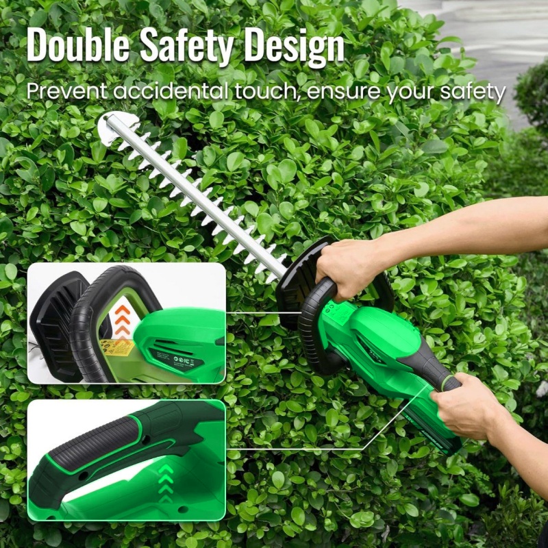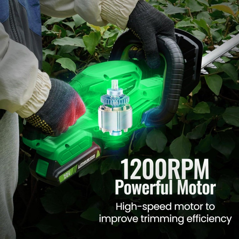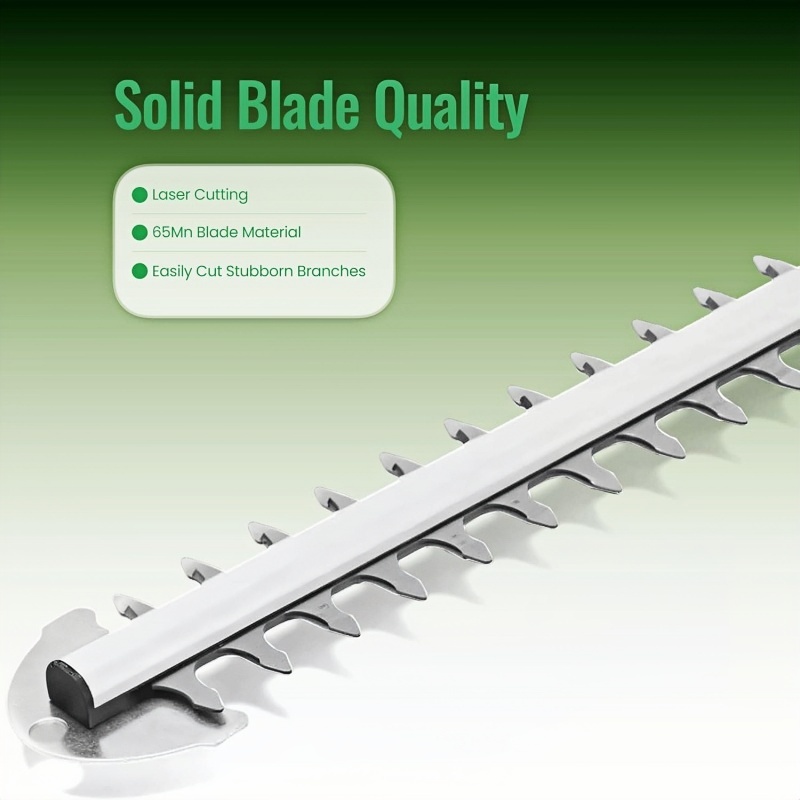 This cordless hedge trimmer combines power and precision for professional-grade results. Its 20V brushless motor delivers robust, maintenance-free cutting, handling branches up to 16mm thick with ease. The 450mm laser-cut blade ensures clean, smooth cuts, while the versatile rotating handle adapts to any trimming angle for comfortable use. Enhanced with an electronic brake for immediate safety and a durable aluminum blade cover, it is built for both performance and longevity. Enjoy the freedom of cordless operation with a tool designed for efficiency, control, and reliable yard maintenance.