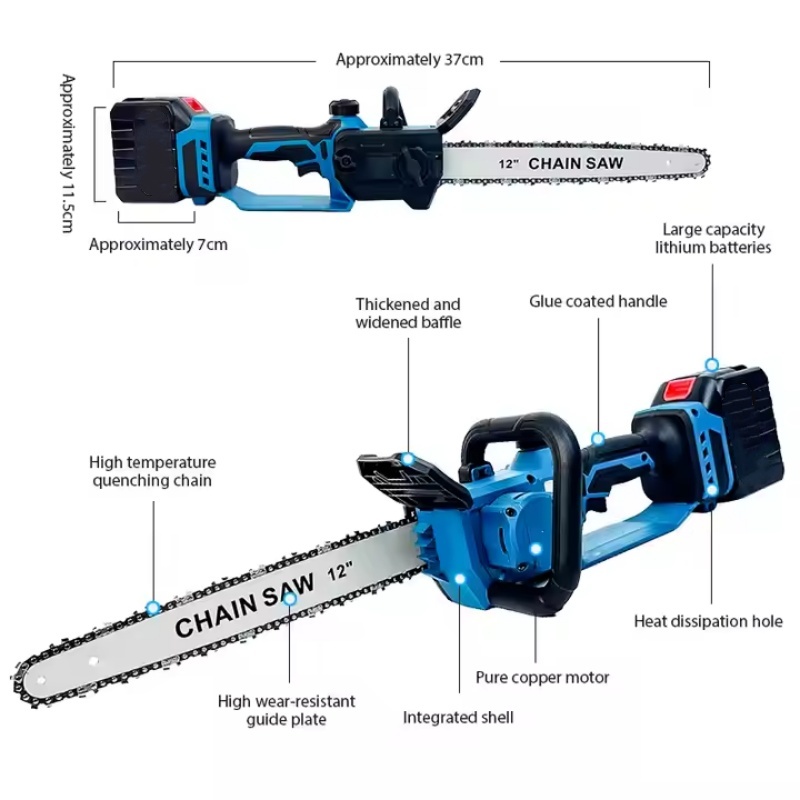 This cordless chainsaw features a 4.0Ah battery for over 30 minutes of use and a fast charger. Its high-performance brushless motor delivers strong, efficient cutting power. Lightweight with an ultra-narrow guide plate, it's compact and flexible for tight spaces. Tool-free chain adjustment simplifies maintenance. Perfect for pruning, gardening, and firewood processing, it combines portability and high efficiency for daily outdoor tasks.