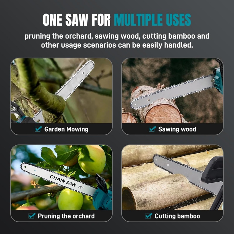 Multiple Usage Scenarios: This electric chain saw is an ideal tool for yard fruit tree pruning, garden maintenance, and outdoor camping firewood processing, featuring excellent flexibility and portability.