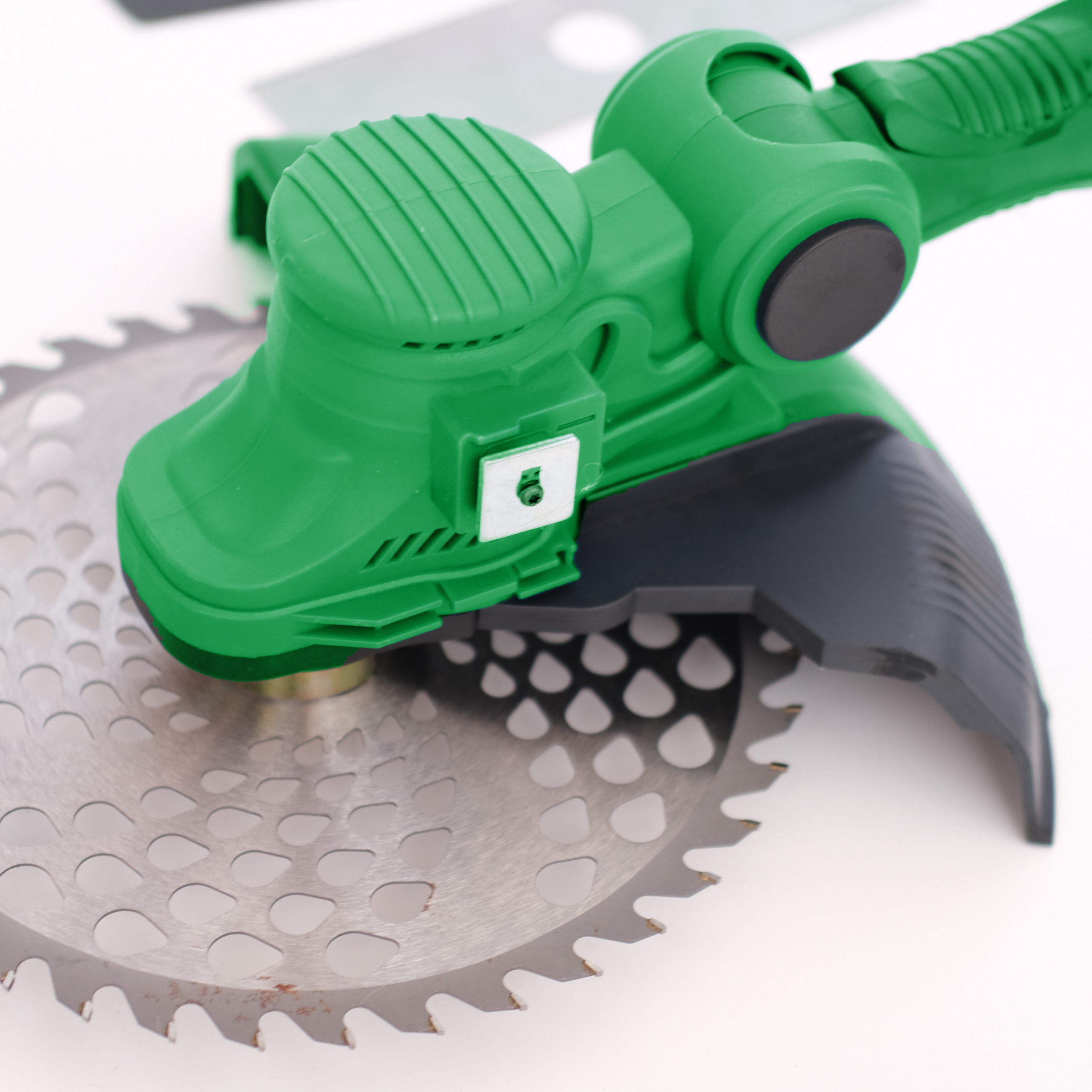 The Cordless Grass Trimmer comes with 1pc tct blade and 2pcs 2t blades, including a grass trimmer head for mowing lawns, weeds, and small shrubs, and the circular saw blade is designed specifically for tackling thicker shrubs.