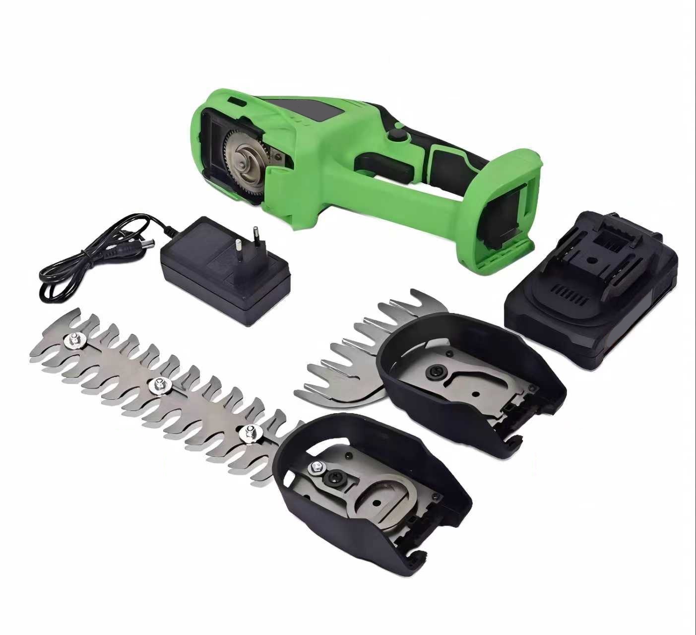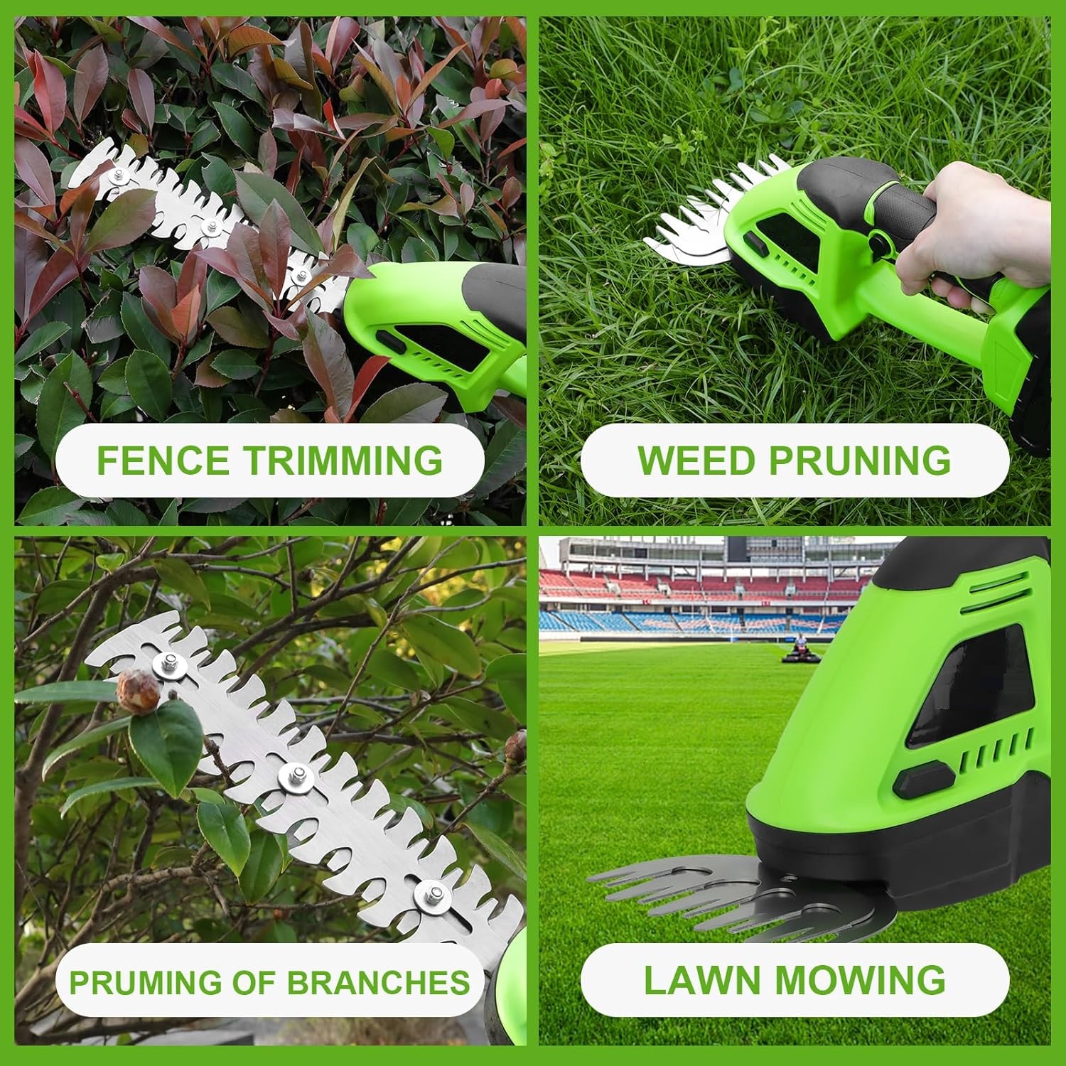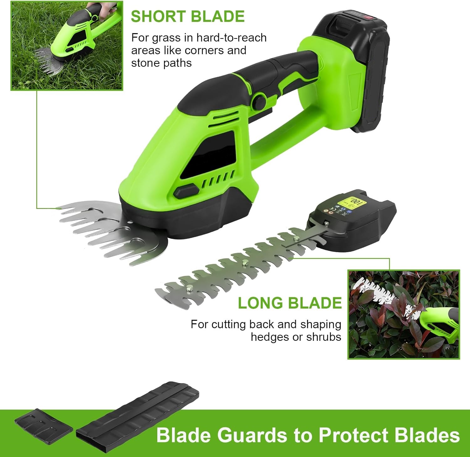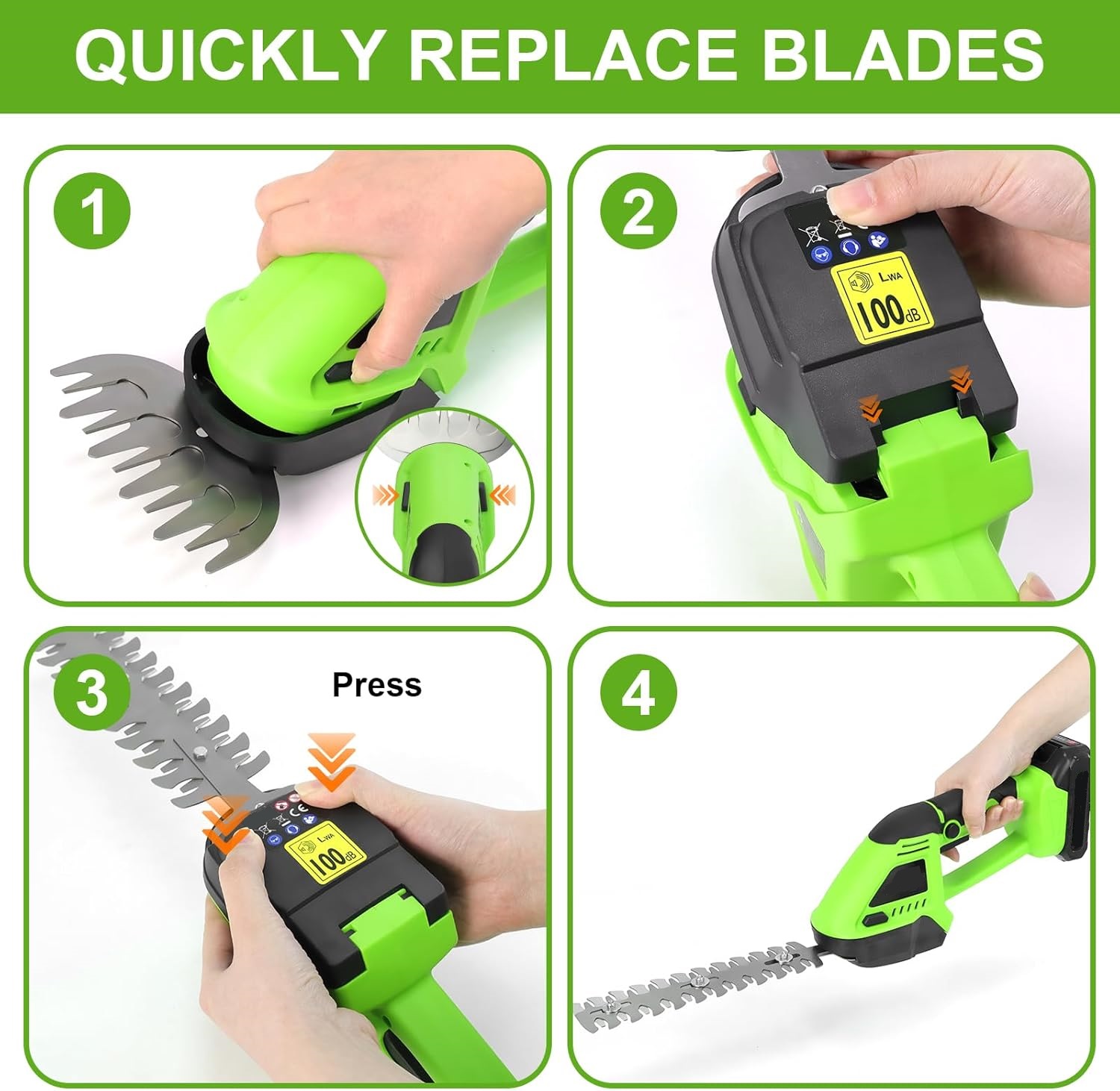 Cordless Hedge Trimmer & Shrub Shear: This 2-in-1 electric garden tool comes with garden shears grass blade; The hand held hedge trimmers cordless allows for quick blade changes with the blade release button; The short blade is used for cutting grass and the long blade is used for cutting fine branches on hedges, bushes and ornamental shrubs