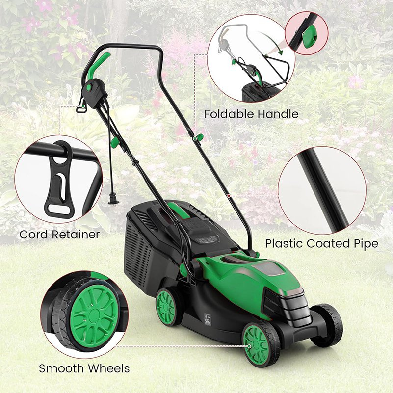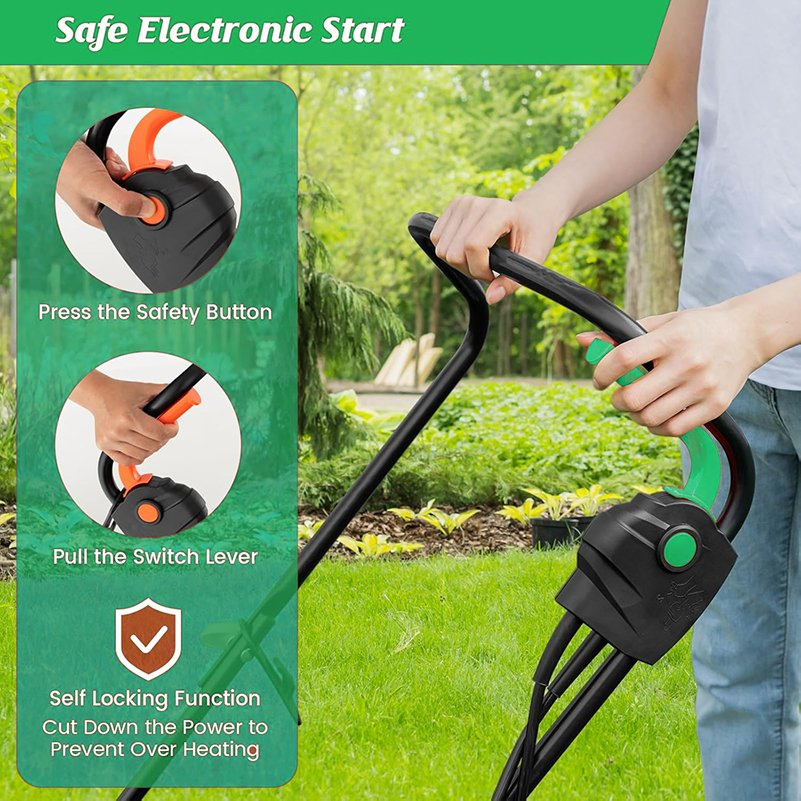 This corded electric walk-behind lawn mower combines power and practicality for hassle-free lawn care. Its 3800 rpm motor and 14-inch deck ensure fast cutting, while 5-position height adjustment (1''-3'') adapts to diverse grass types. The double-switch design guarantees safe operation, and its gas-free, zero-emission build is eco-friendly. With 5.5-inch wheels, an ergonomic grip, a 35 L grass box and a foldable handle, it offers labor-saving control and space-efficient storage for a seamless mowing experience.