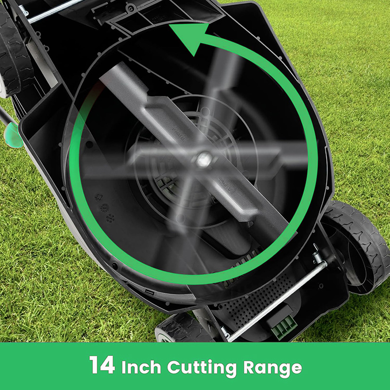 Powerful & Efficient Cutting:Equipped with a high-performance motor running at 3800 rpm and a 14-inch cutting deck for fast, efficient lawn trimming.