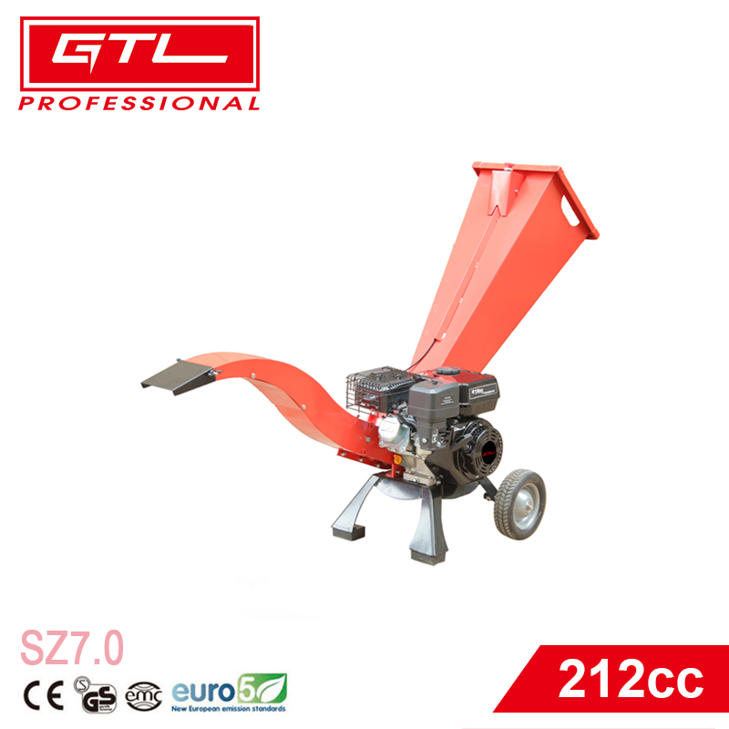 This wood chipper features a 50mm chipping capacity, powered by a 7.0HP 212cc OHV 4-stroke engine with recoil start, designed for efficient branch and wood debris processing in gardening and landscaping.