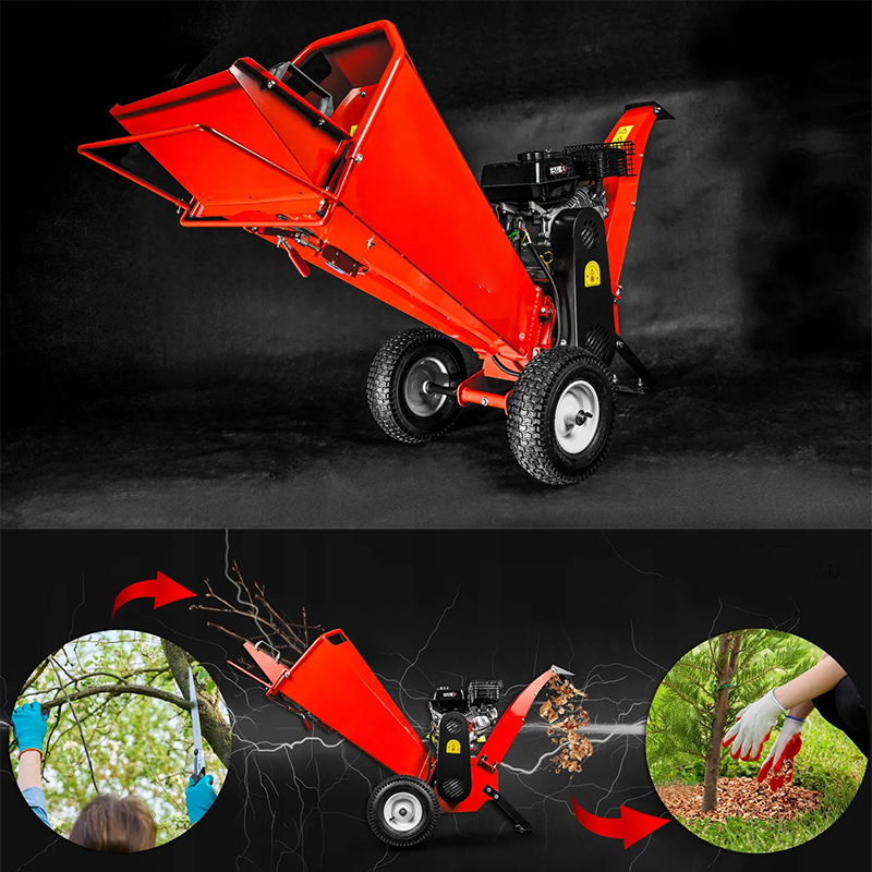 Equipped with a 3.6L unleaded gasoline tank, 0.6L oil capacity, and a pneumatic wheel, it operates at 3600rpm engine speed and 2700rpm blade speed, suitable for both residential and light commercial wood chipping tasks.