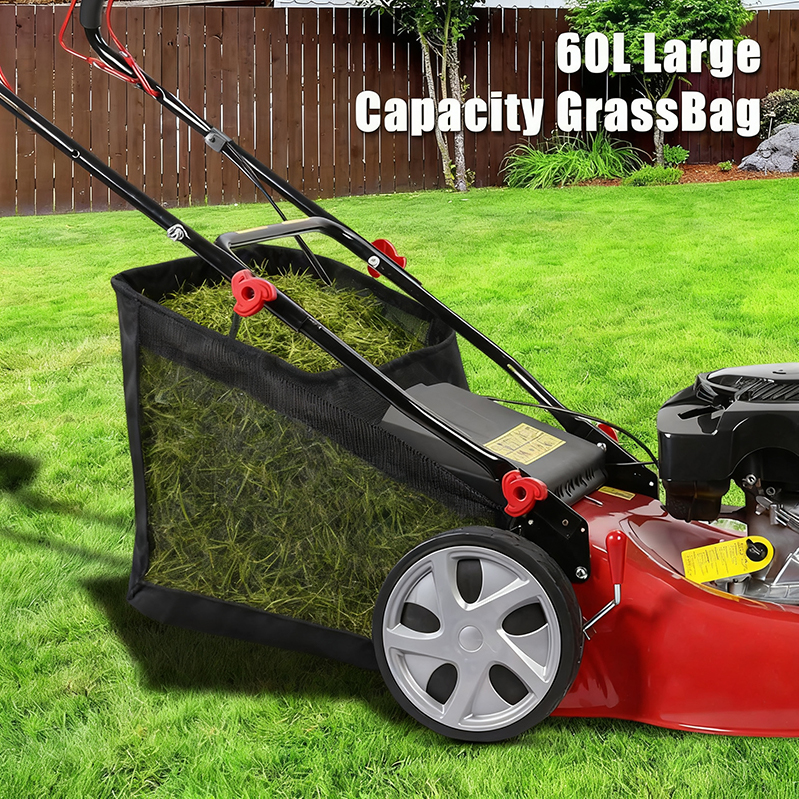 60L Grass Tank: Side discharge rail easily attaches without tools or hardware when needed. With 60L grass tank, the self-propelled lawn mower can collect a large amount of green grass. Big wheel design is convenient to transport. Large collection bag with widened mouth opening for maximum collection and quick emptying, providing maximum yard work convenience.