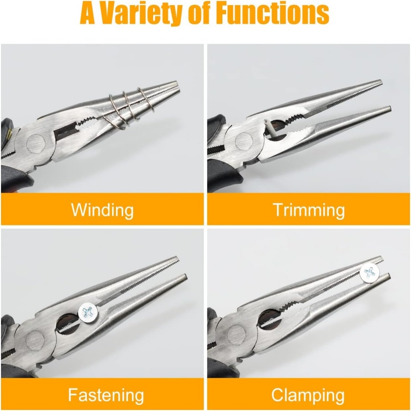 Labor-saving Design:The needle-nose pliers are designed on the principle of lever. The length of the pliers wall is larger than the pliers head, so it saves more energy when using. Lengthen clamp head design, easy to use in narrow space; It has the functions of fastening, clamping, winding, cutting and stripping