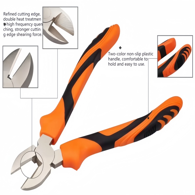 These diagonal cutting pliers are forged from highquality steel for superior hardness and strength, stable and durable under heavy use. Hightemperature quenching enhances sharpness and rust resistance, easily cutting cables, steel, and copper wires. The wideopening design ensures smooth cutting. Ergonomic nonslip handles reduce fatigue for secure grip. Ideal for industrial, electrical, and daily cutting tasks.