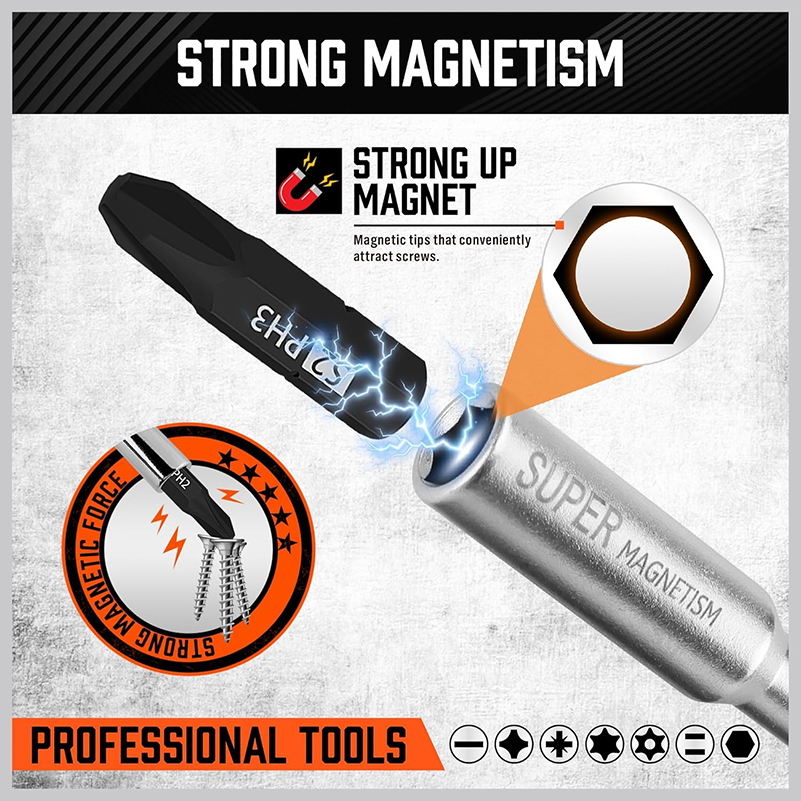 Premium Quality & Durability: All bits and sockets are made from high-hardness CR-V steel with a polished finish, offering excellent wear resistance and torque strength. The set is built to withstand heavy-duty use in automotive, construction, and home repair applications.