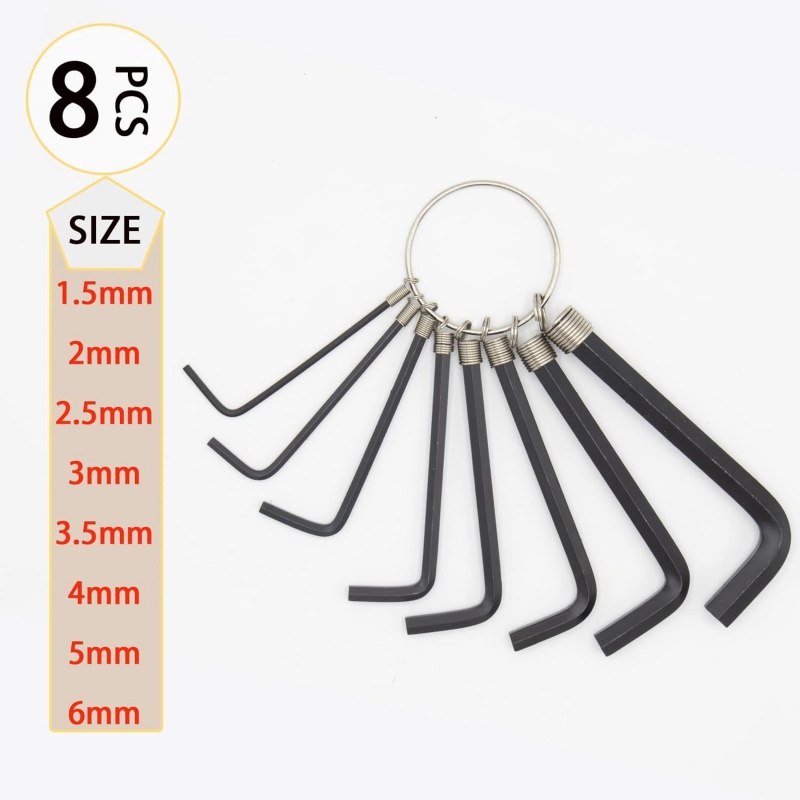 This hex key set features premium high carbon steel construction, delivering exceptional hardness, durability and reliable performance for frequent high-torque use. Its L-shape design offers great leverage, easy access to tight spaces, and comfortable grip to reduce hand fatigue. Compact, lightweight and equipped with a keychain for easy carrying and organization, it suits mechanics, DIY lovers and bike owners, ideal for furniture assembly, bicycle maintenance, machinery repair and various daily tasks with multiple sizes available.
