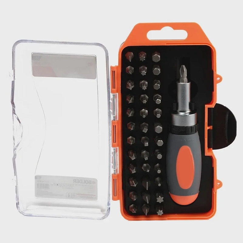 This 38-piece CRV screwdriver bit set includes 36 standard 25mm bits and a stubby ratchet handle, offering versatile compatibility with Phillips, Pozi, Slotted, Hex, and Torx screws. Designed for compact spaces and everyday repairs, it features durable CRV steel bits and a ratchet handle for fast, efficient screw driving.