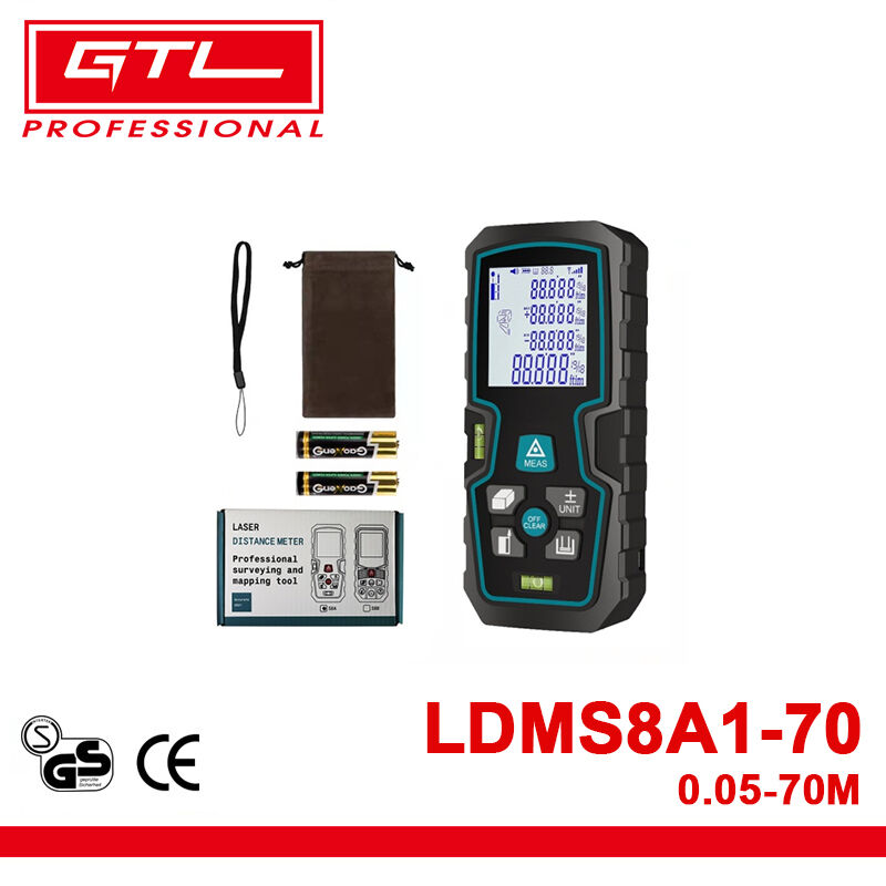 This 0.05-70M laser distance meter features ±1.5mm accuracy, IP54 protection, and a 2.2-inch backlit screen. It supports multi-unit measurement (m/ft/in) and core functions like area/volume calculation, with 20 data memories for efficient surveying.