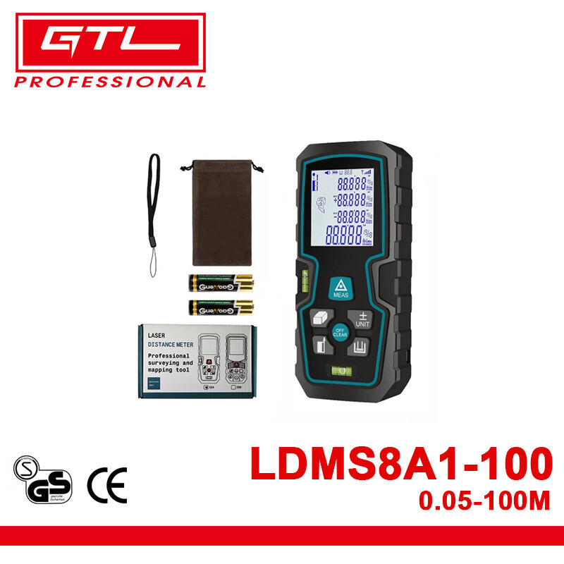 This 0.05-100M laser distance meter features ±1.5mm accuracy, IP54 protection, and a 2.2-inch backlit screen. It supports multi-unit measurement (m/ft/in) and core functions like area/volume calculation, with 20 data memories for efficient surveying.