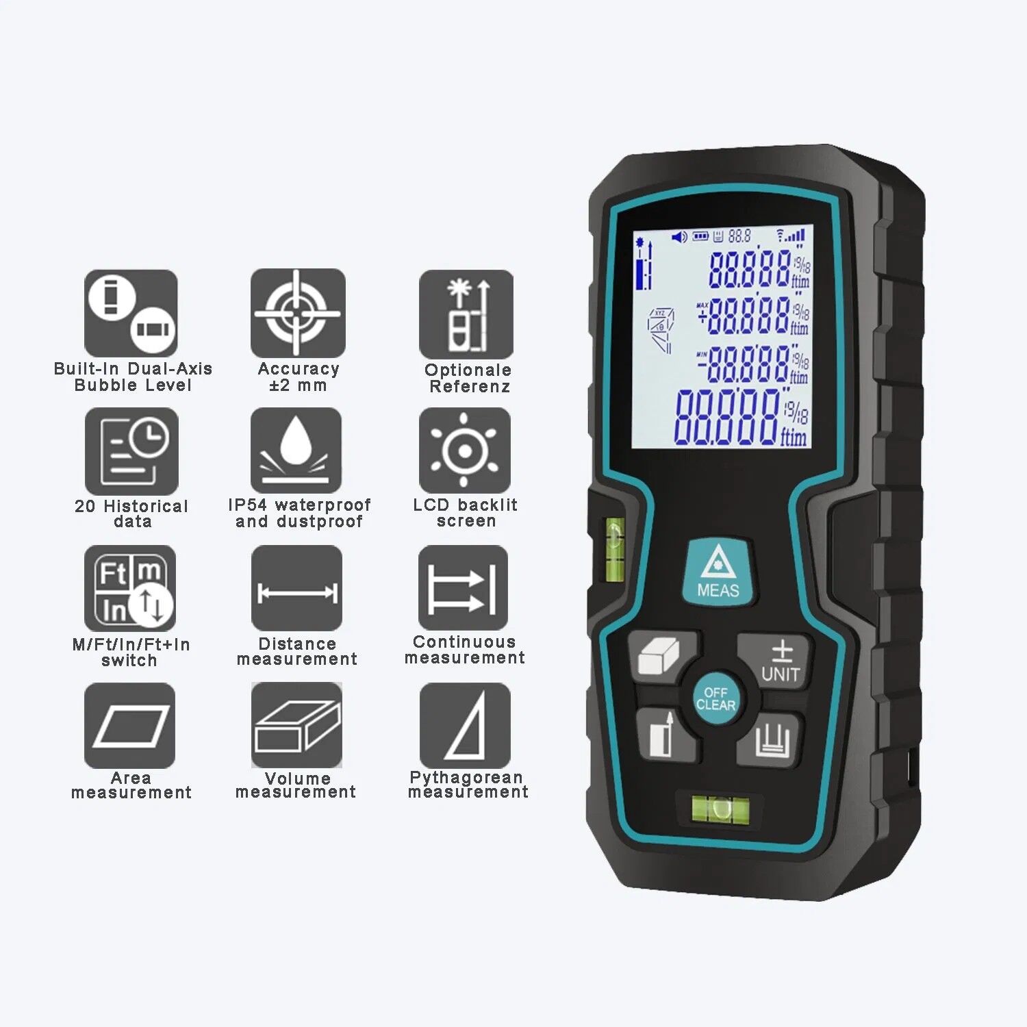 Comprehensive Core Functions: Covers distance/area/volume measurement, indirect Pythagorean calculation, and add/subtract functions. It also supports 2-point starting point adjustment, 20 data memories, and max/min tracking for diverse survey needs.
