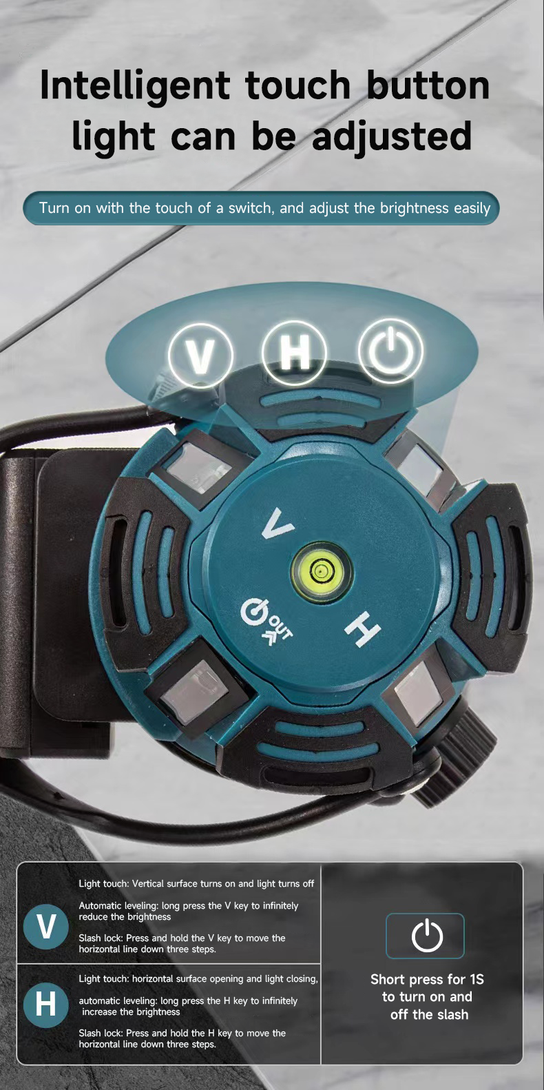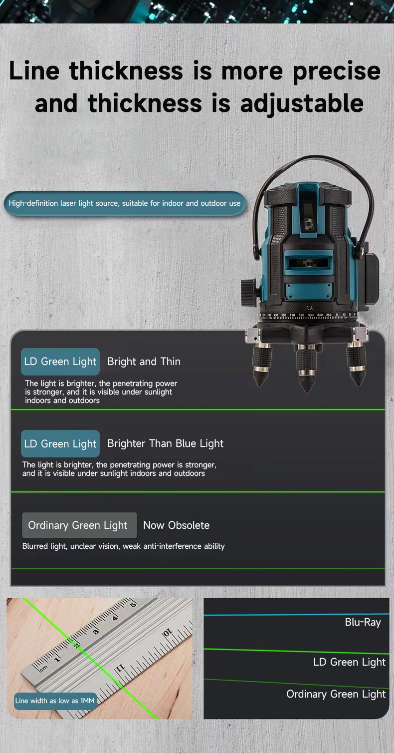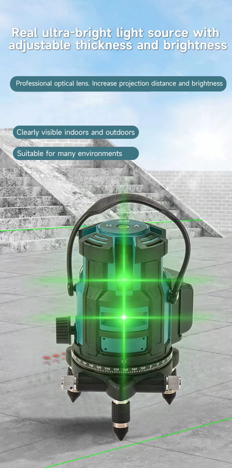 This green laser level features 5 bright green lines with ±1mm/5m accuracy and a wide 120° horizontal & vertical shooting angle. It offers ±4° automatic leveling for fast, precise setup on uneven surfaces. Designed for extreme conditions, it operates in temperatures from -10ºC to 50ºC, perfect for year-round indoor and outdoor use. The 1200mAh lithium battery provides cordless convenience, and the included goggles enhance beam visibility in bright light. The complete kit comes with a charger, battery, and manual - ready to use right out of the box. Ideal for hanging pictures, installing tiles, laying pipes, or framing walls.