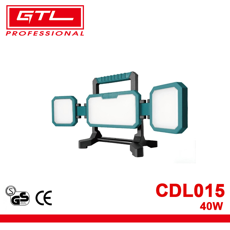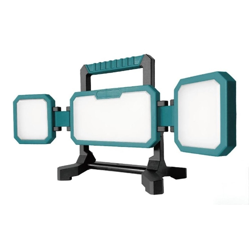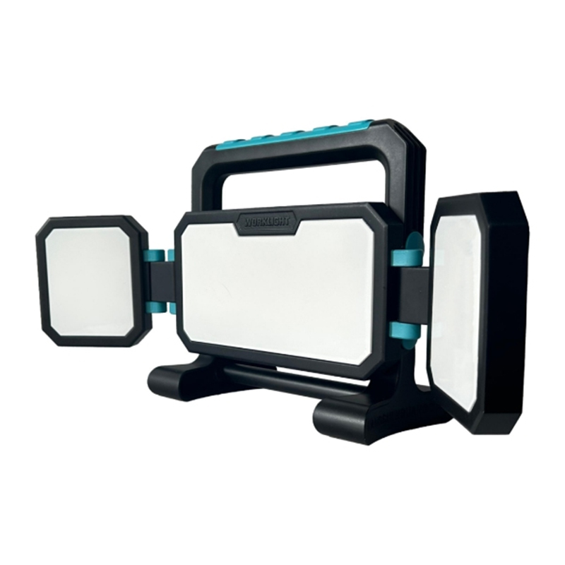 his 20V cordless LED work light (40W, SMD2835) features 3 brightness modes (800/1600/3200LM) and 4 CCT options (3000K-6500K), with a durable PC+AL+PA6 build, 120° beam angle, and foldable design for versatile tasks.