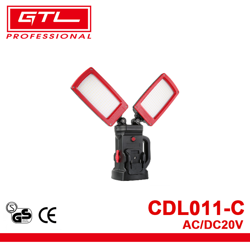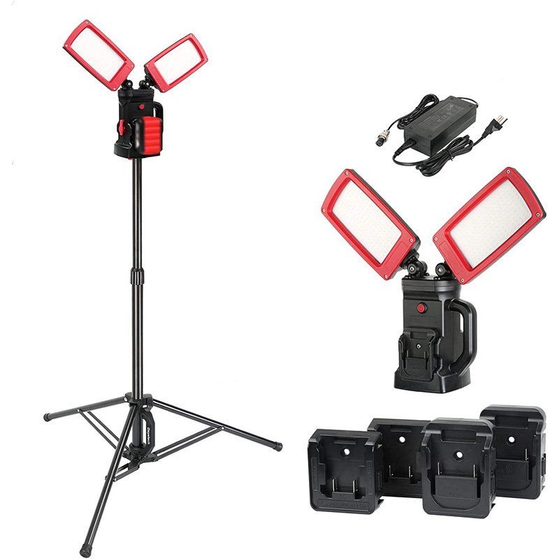 This AC/DC 20V LED work light features dual independently controlled lamp heads, 7 brightness levels (up to 12000LM), and 5000K daylight white light with CRI>80, ideal for clear, flicker-free lighting in video/photography and work scenarios.
